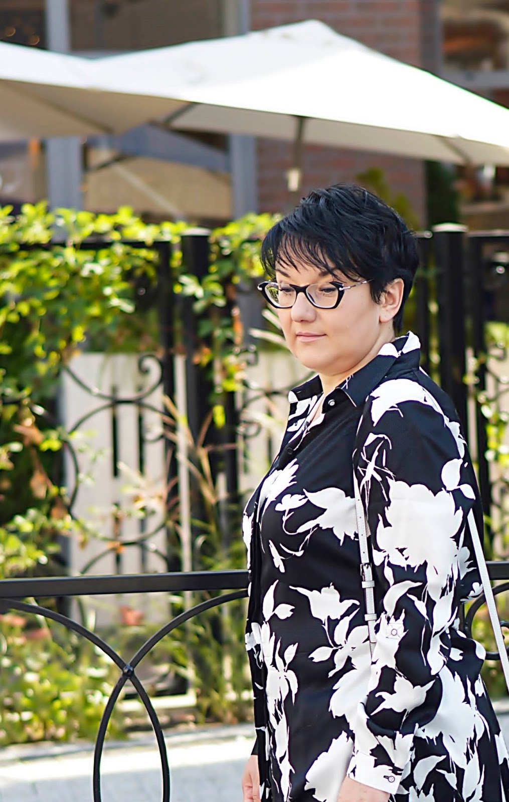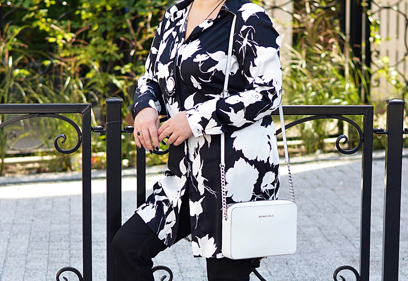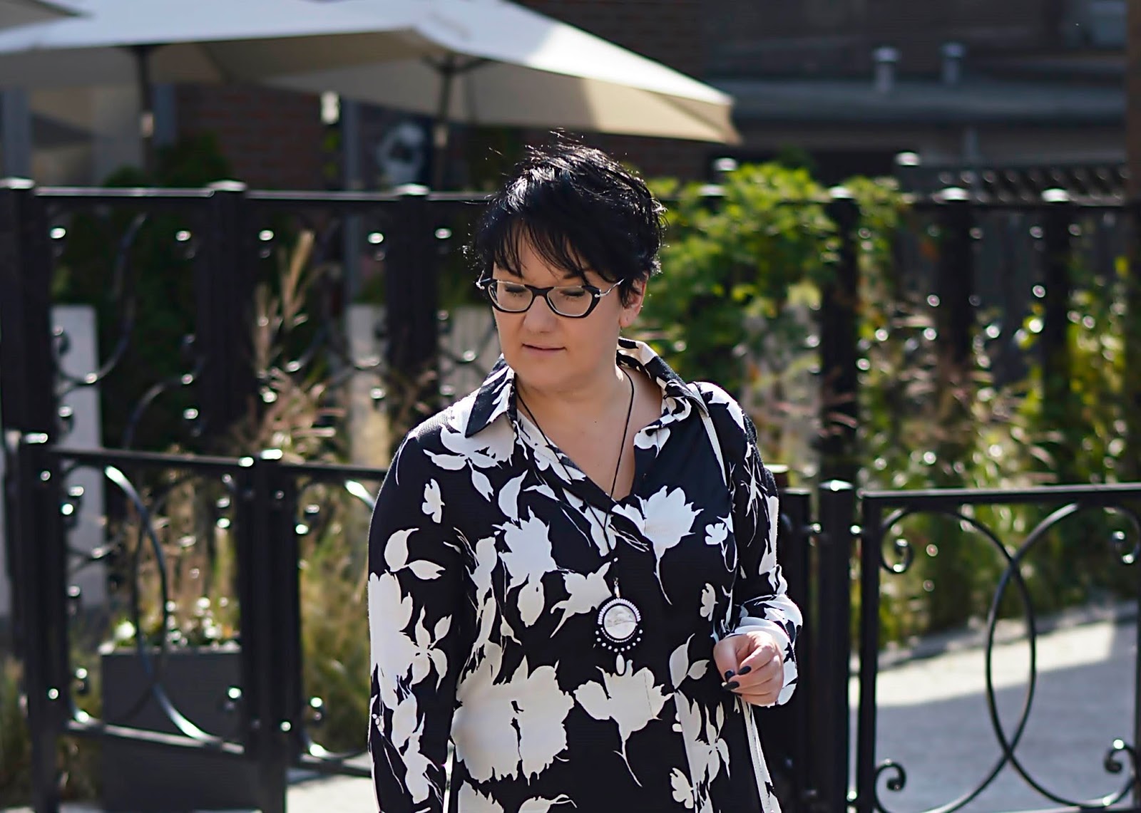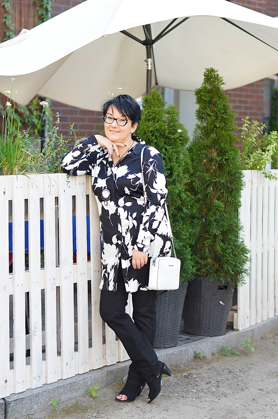 Tę kwiecistą sukienkę zobaczyłam w Reserved jeszcze latem. Te kwiaty i fason, mmmm. W dodatku w "moich" kolorach. Dostępna była w kolekcji "must have", co niestety owocowało dosyć wysoką ceną. Uszyta jest z wiskozy, więc myślałam, że to za tkaninę "się płaci". W dotyku jest bardzo miła. Ostatecznie, kilka tygodni później trafiłam na promocję chyba dwudziestoprocentową, więc jak widzicie, jest moja. Wracając do tkaniny; miałam ja na sobie tylko raz i po powrocie do domu, w miejscu, gdzie dotyka jej torebka, powstały zmechacenia. Jestem bardzo zawiedziona. Po jednym noszeniu ? to co będzie po kolejnych ? Po praniu ? Z tym dylematem trwam od kilku tygodni, bo szkoda oddać mi jej do reklamacji...Oczywiście można założyć ją solo. Wielbicielki serialu "Przyjaciółki" zapewne pamiętają Zuzę w tej sukience. Ja jednak od razu widziałam ja ze spodniami. Ma ona pasek; nie zawiązałam go tradycyjnie, tylko z tyłu, co prezentowało się dużo lepiej.Dla rozjaśnienia klasyczna biała torebka.