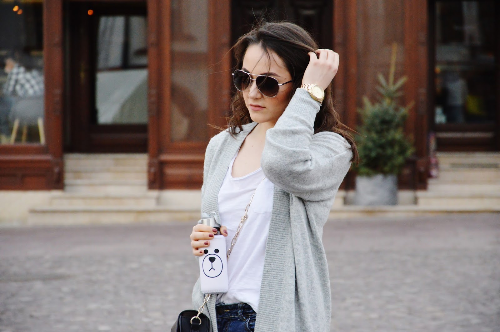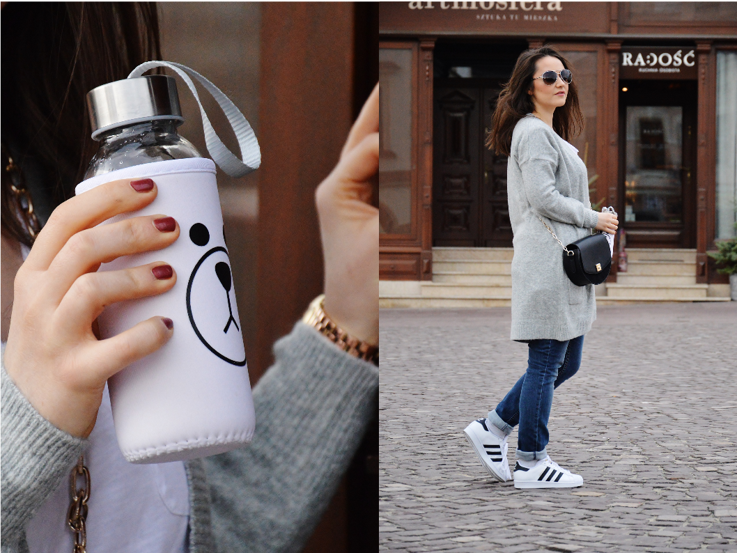 Sneakers- Adidas Superstar/Cardigan- Cubus/ T-shirt- Stradivarius/ Jeans- Mango/ Sunglasses- Mango/Bag- Zara/ Watch- Claire's/Bidon- Sinsay