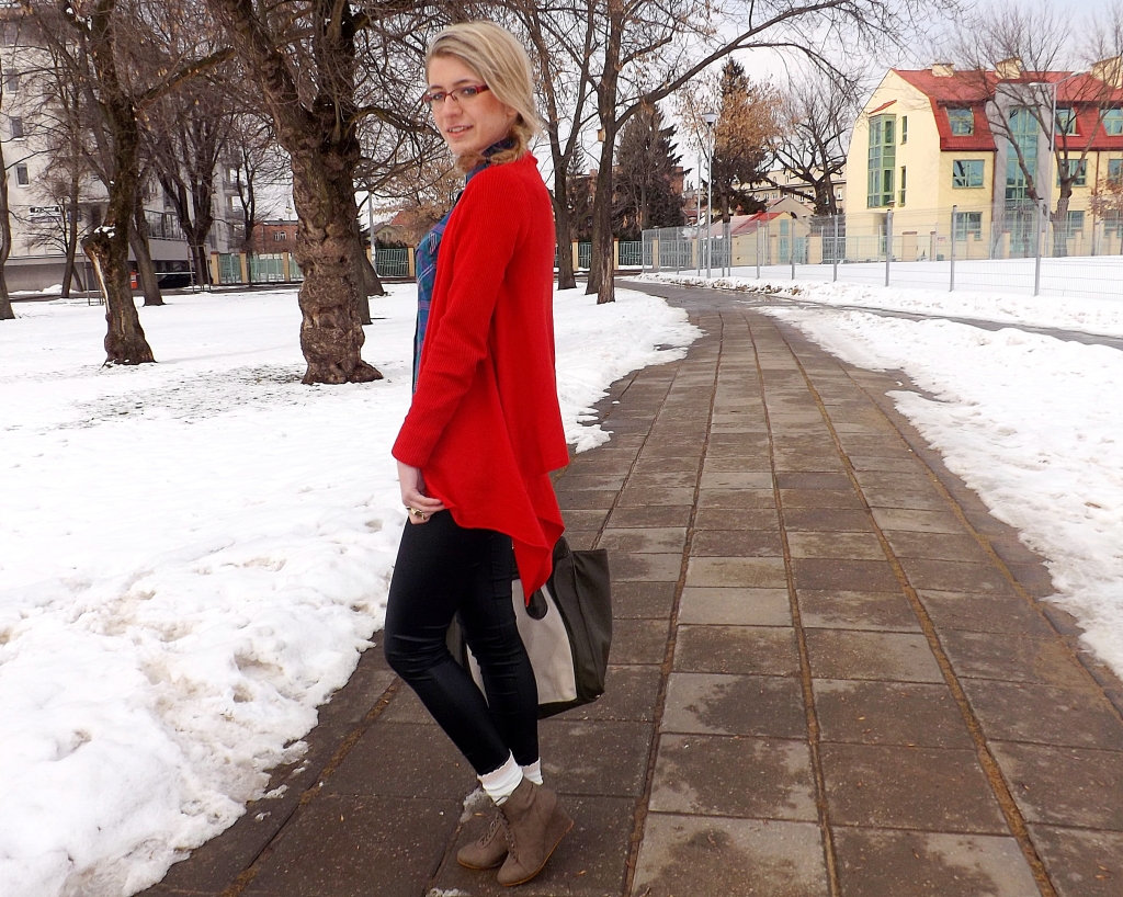 Przyznam, że niezbyt przepadam za kolorami, pewnie dlatego jest ich bardzo mało w mojej szafie. Warto jednak czasami przetrzymać ciuchy kupione dość dawno, gdyż mogą zawsze wrócić. Tak się stało z czerwienią, i mój sweterek jest teraz strzałem w dziesiątkę. Aj i moja ogromna słabość- skarpetki na wierzchu ;)