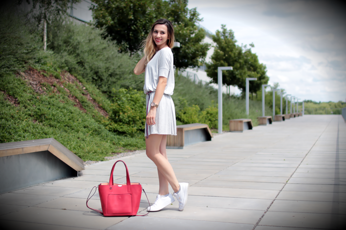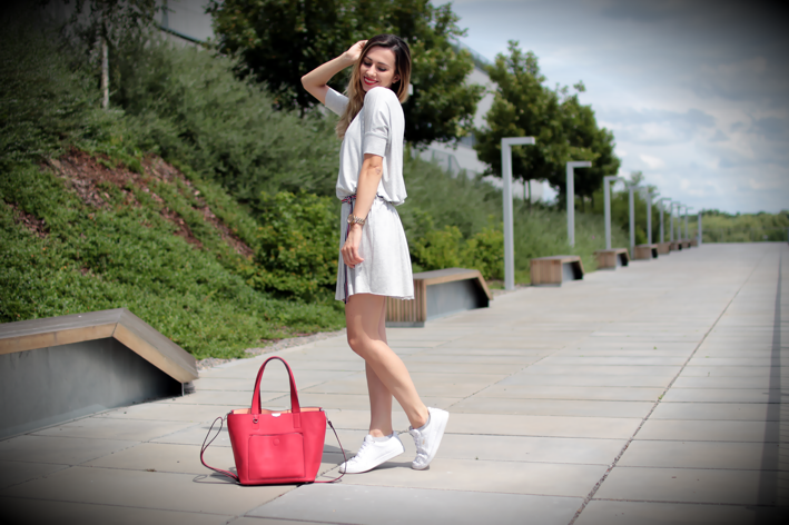 SZARA SPORTOWA SUKIENKA Z PASKIEM I CZERWONY SHOPPER