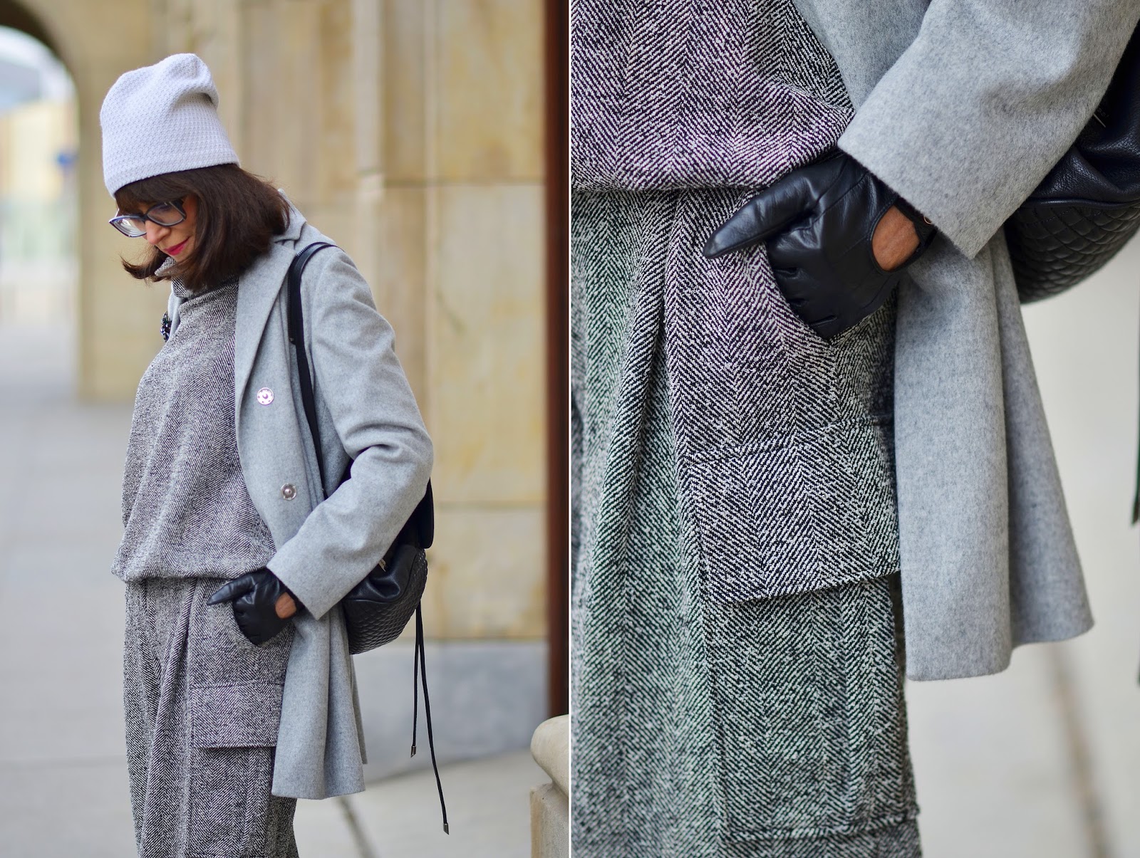 Ale, że mamy zimę to sam komplet nie wystarczy i trzeba coś jeszcze narzucić ;) Popielaty, wełniany płaszczyk będzie w sam raz! Jeszcze tylko czapka i plecak zamiast torebki ... i zestaw gotowy :)