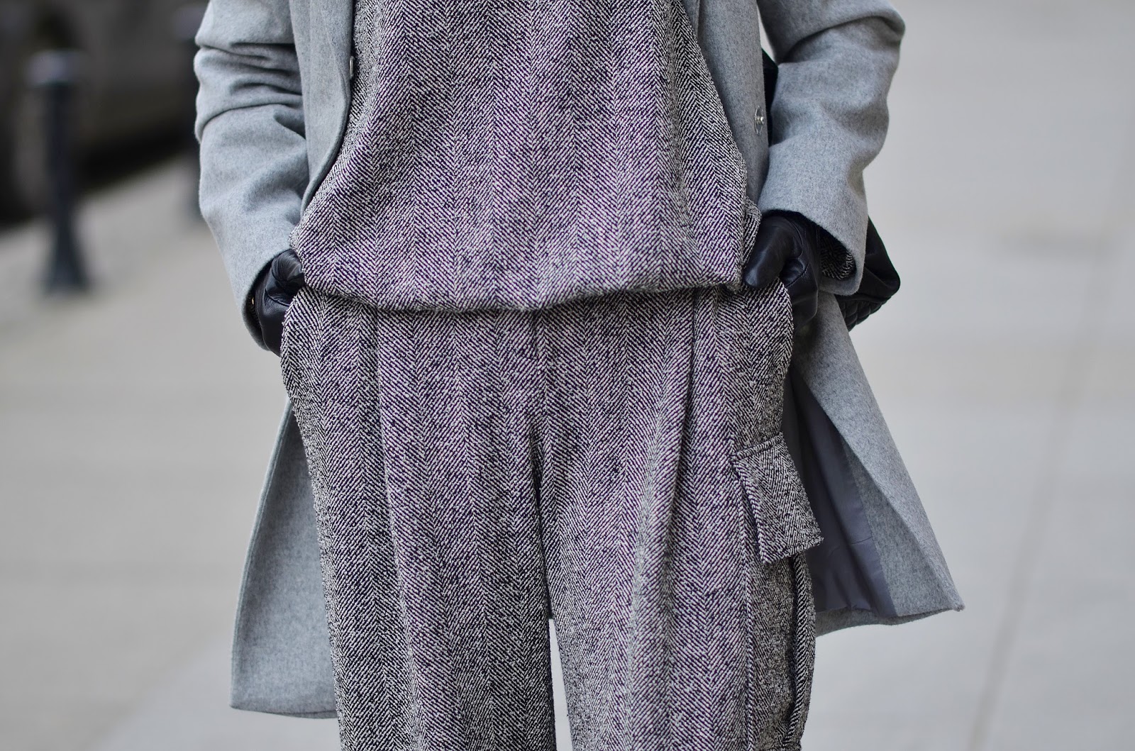 Stylizacja: to, że świetnie się czuję w tej stylizacji to widać :) Po pierwsze to mój ulubiony fason: długie szerokie spodnie, na luzie , z klasą i z charakterem :) Po drugie to jodełka, wzór, który uwielbiam i cieszę się, że powraca :) A po trzecie to szarość, szarość to taka moja "czerń", ale zdecydowanie ciekawsza :) Szarość ma tyle odcieni, ze wszystkimi kolorami się "koleguje" i jak dla mnie jest to Nr 1! :) Najbardziej lubię tą jasną, ale ciemna też jest OK ;)