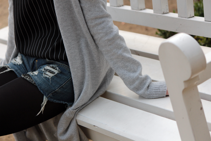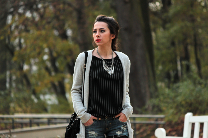 SZARY DŁUGI KARDIGAN I T-SHIRT W PASKI