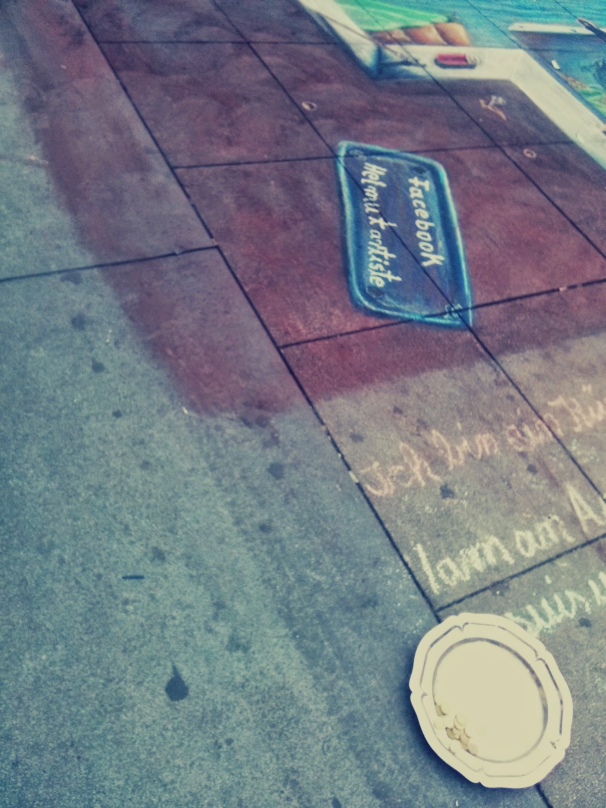 Dzisiaj nie widzę już dzieci rysujących kredą, mam wrażenie, że nie tylko my wyrosłyśmy z tej zabawy, ale dzieciaki młodsze od nas o pokolenie również uznały to za zbyt infantylną formę rozrywki. Tym bardziej zdziwiłam się, gdy na ulicach miasta, przed wielkim centrum handlowym, ujrzałam ogromne malowidło powstające na oczach wszystkich przechodniów. Ku mojemu zdziwieniu, artysta trzymał w ręce kredę, i to niejedną. Okazuje się, że przy odrobinie inwencji twórczej nawet tak (z pozoru) prosta czynność jak rysowanie kredą, może okazać się sztuką na wysoką skalę. Parę przecznic dalej spotkałam kobietę, która tym samym sposobem tworzyła dzieło sztuki dla kolejnych spacerowiczów.