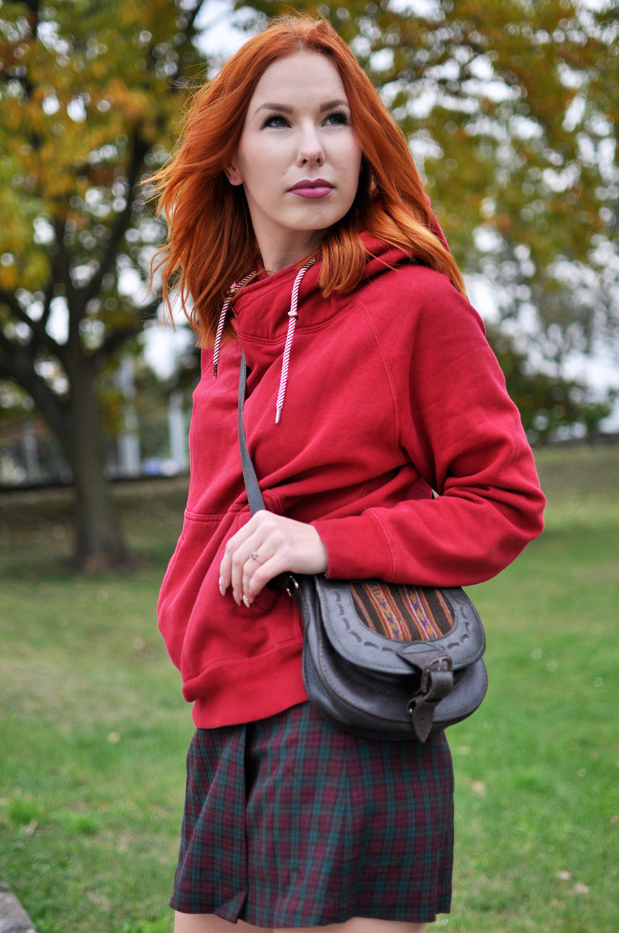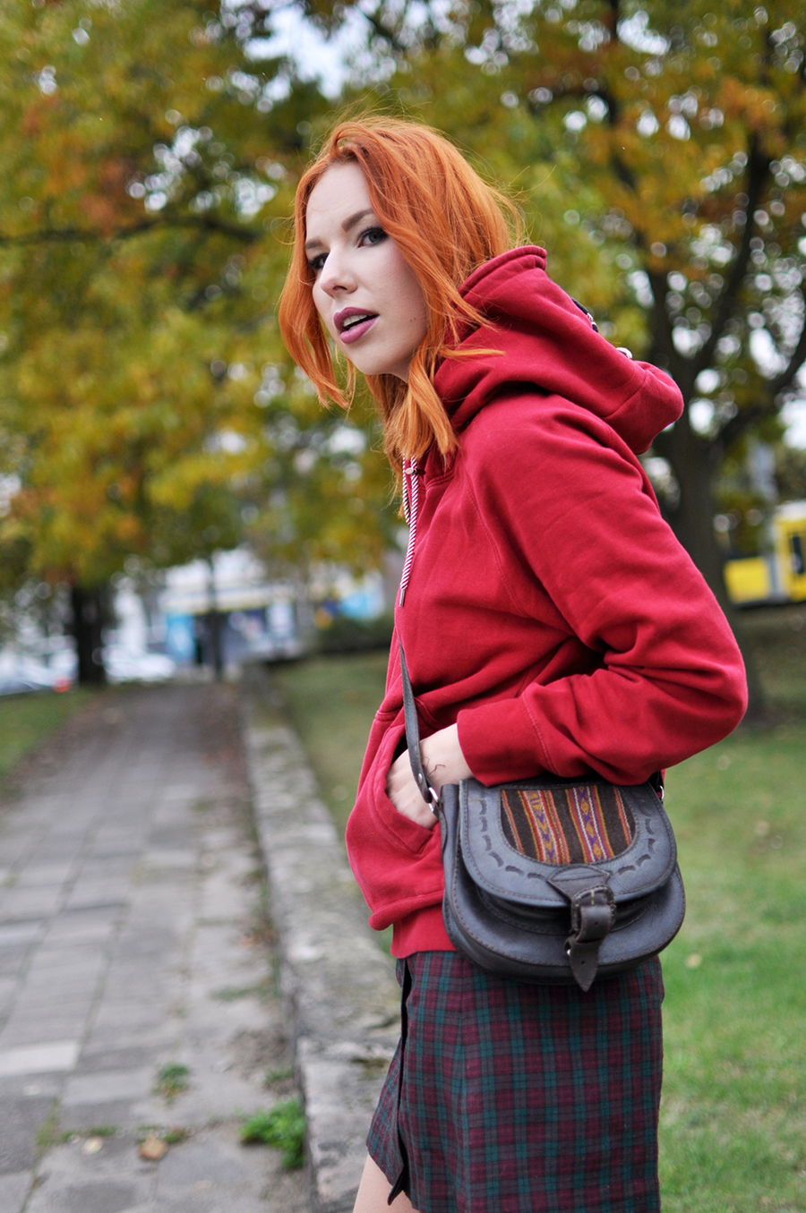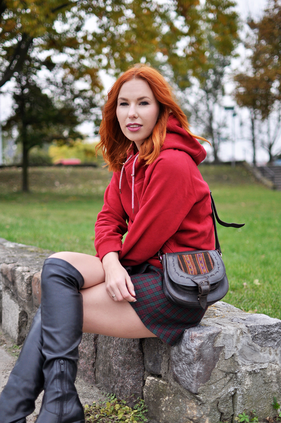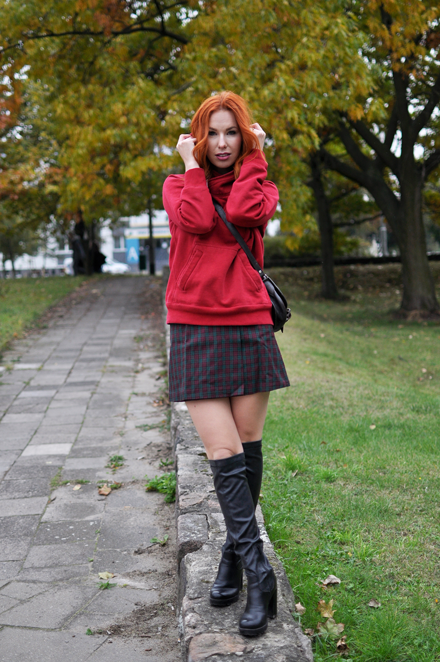 Połączenie mini spódnicy w kratę z luźną bluzą i długimi kozakami za kolano. Z jednej strony spódnica i dopasowane kozaki tworzą nieco elegancki look, z drugiej bluza z kapturem przełamuje elegancję, nadając tym samym nieoczywistego charakteru. Do tego torebka przewieszona na skos. Pamiętacie czasy szkoły podstawowej? Wtedy wszyscy tak nosili torebki. Jak widać moda do nas wraca i dziś ten sposób noszenia toreb króluje na większości pokazów, światowych tygodni mody.