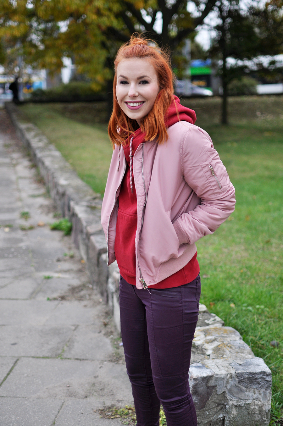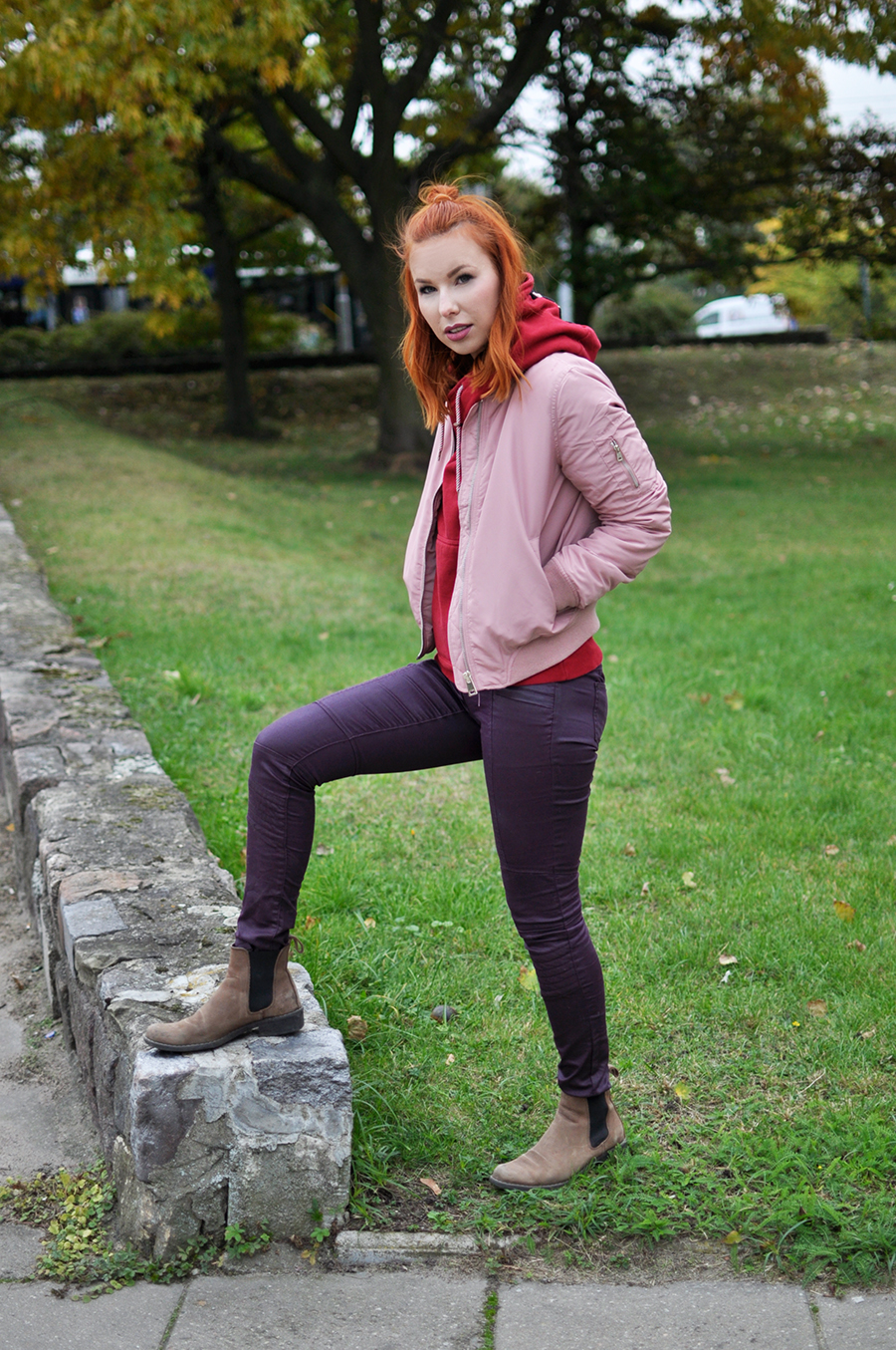 Nic dziwnego, że kojarzymy ją ze sportem. Nie do końca wychodzimy z tego tematu. Ta propozycja utrzymana jest w tonacji z jeansami, tyle że woskowanymi i w burgundowym odcieniu. Ten kolor rządzi każdej jesieni, tak będzie i w tym roku. Do tego sztyblety, czyli obuwie idealne na tę porę i kurtka typu bomber. Bombery, jak na tę nazwę przystało bombardują nas zewsząd, ale ich czas jeszcze w żadnym razie nie minął. I dobrze bo wygodne są i świetnie wyglądają.