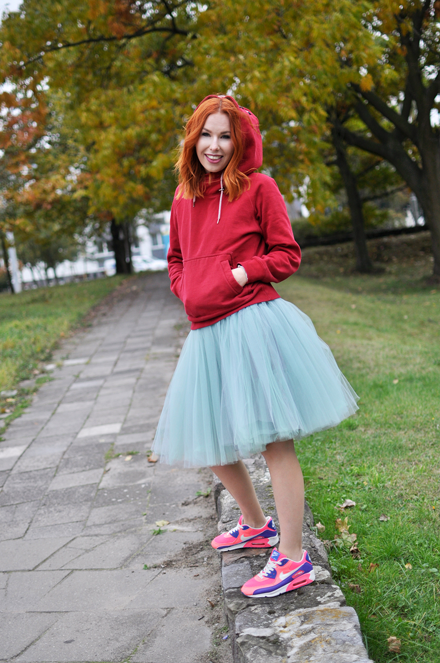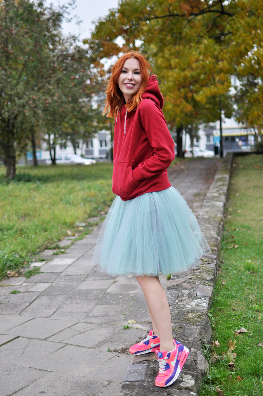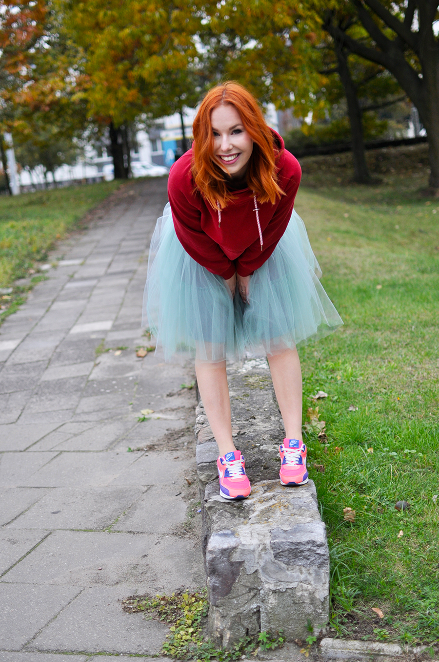 Kolejna i ostatnia propozycja to oczywiście moja interpretacja. Trochę zwariowana, trochę odważna. Chociaż nie uważam by coś ekstrawaganckiego było jeszcze w tiulówkach. Jesień jest często dość smutną porą roku, zwłaszcza przez ponurą pogodę. Trzeba zatem ją jakoś rozjaśniać i to jest moja propozycja na roześmianie jesieni. Miętowa, tiulowa spódnica i rażąco różowe air maxy rozweselą nie jednego przechodnia, a i wam zrobi się milej. Uśmiech sam się pojawia na twarzy.