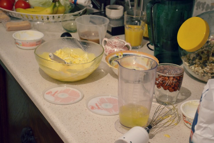 A na koniec małe zdjęcie z bekstejdżu. Właśnie odkryłam, że moja kuchnia podczas pieczenia i gotowania za nic nie przypomina tych pięknych pomieszczeń blogerek kulinarnych, w których królują czyste stoły, a między stylowymi naczyniami fruwają płatki róż i gałązki tymianku.
