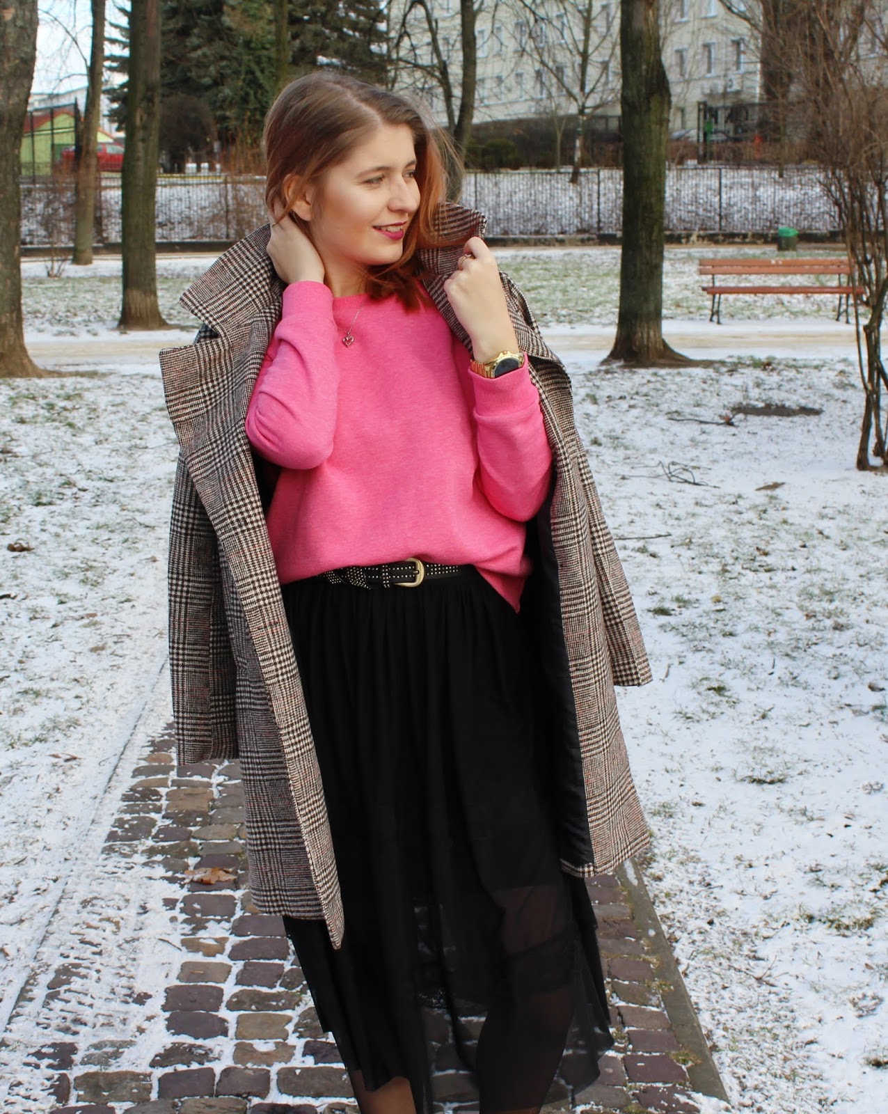 Różowa bluza, to jeden z najtańszych i najlepszych! zakupów w Primark. Mięciutka, na delikatnym misiu wewnątrz i do tego ten kolor. Bluza w połączeniu z tiulową spódnicą midi od BonPrix, to mój zestaw gotowy na wszystko. Spódnica z halką, rozkloszowana, tiulowa, cięta laserowo z ozdobną koronką na środku. Jestem z niej bardzo zadowolona. Dzisiaj dobrałam do niej czarny, klasyczny pasek.