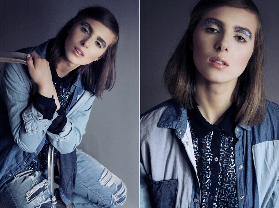 jeansowa koszula Mohito, cekinowa koszula Donna by Mario Conti, spodnie Zara