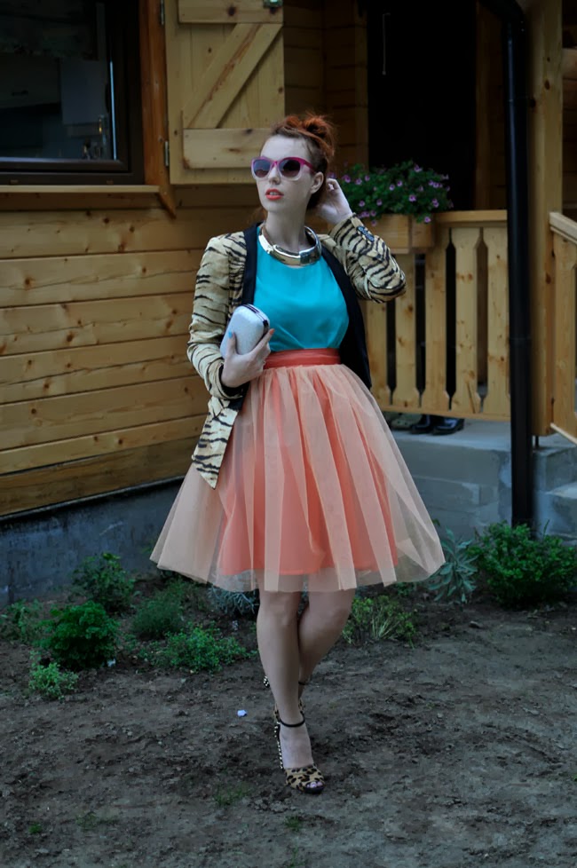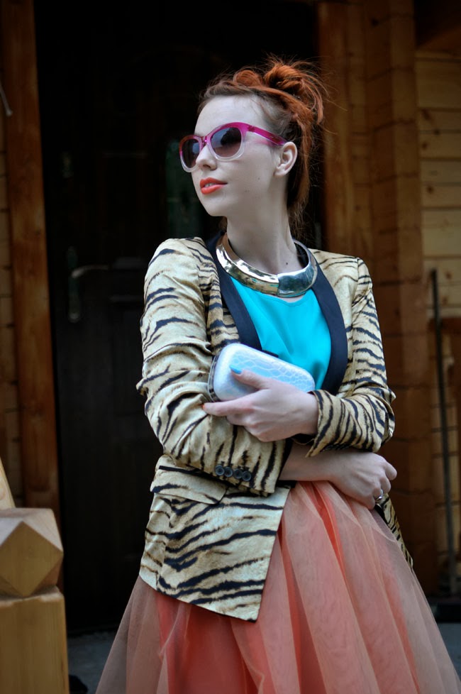 To był mój pierwszy raz na Polskim Tygodniu Mody i powiem szczerze, że chyba dokładnie tak wyobrażałam sobie tę imprezę. Jest oczywiście kilka mankamentów, ale to kwestia wprowadzenia niewielkich zmian. Powoli przygotowuję dla Was obszerną relację z tych czterech, wypełnionych po brzegi dni. Systematycznie będę przedstawiać Wam kolejne kolekcje oraz swoje stylizacje. Tym czasem przed Wami tiulówka w kolejnej odsłonie. Wiem, że część z Was uważa, że często ryzykuję w swoich zestawach, łącząc różne kolory i wzory, pozornie do siebie niepasujące. Jestem jednak zdania, że kto nie ryzykuje, nic nie ma i właśnie dlatego tym razem tygrys pojednał się z panterą. Przyozdobieni turkusem i brzoskwiniowym tiulem, jak dla mnie, prezentują się uroczo;)