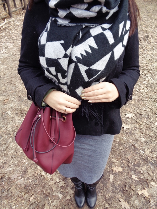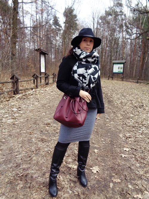 Płaszcz, kapelusz, szal - H&M / Spódnica - Diverse / Torebka - Zara / Kozaki - New Look