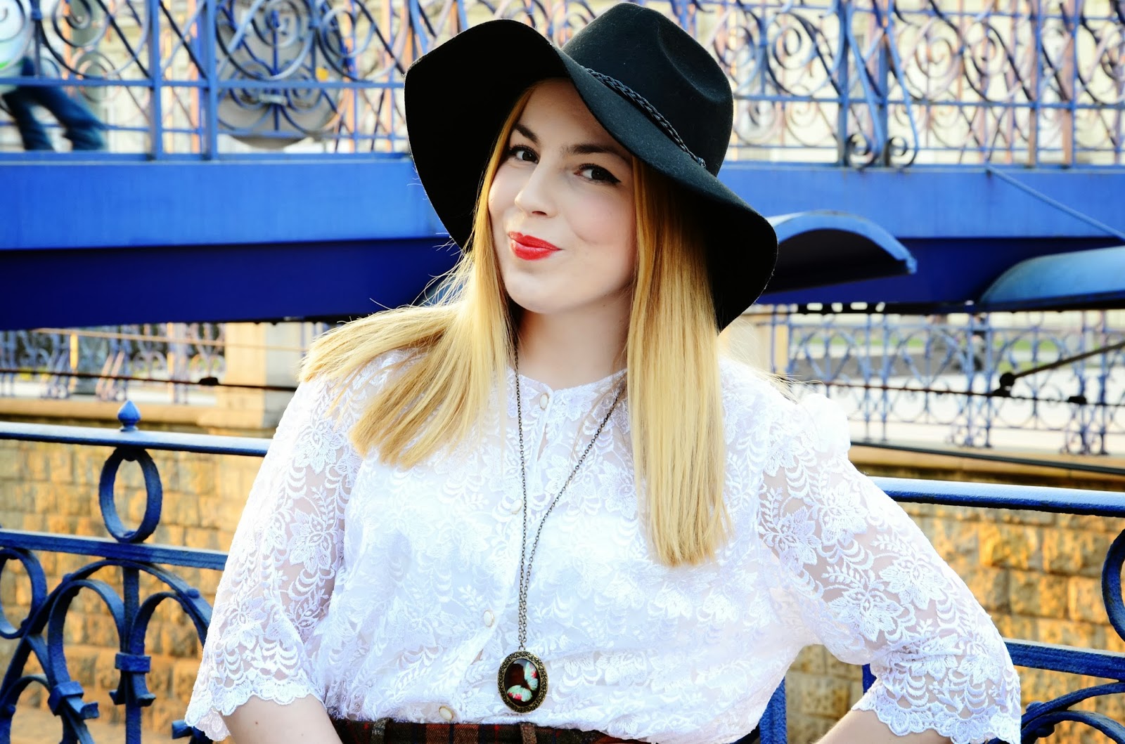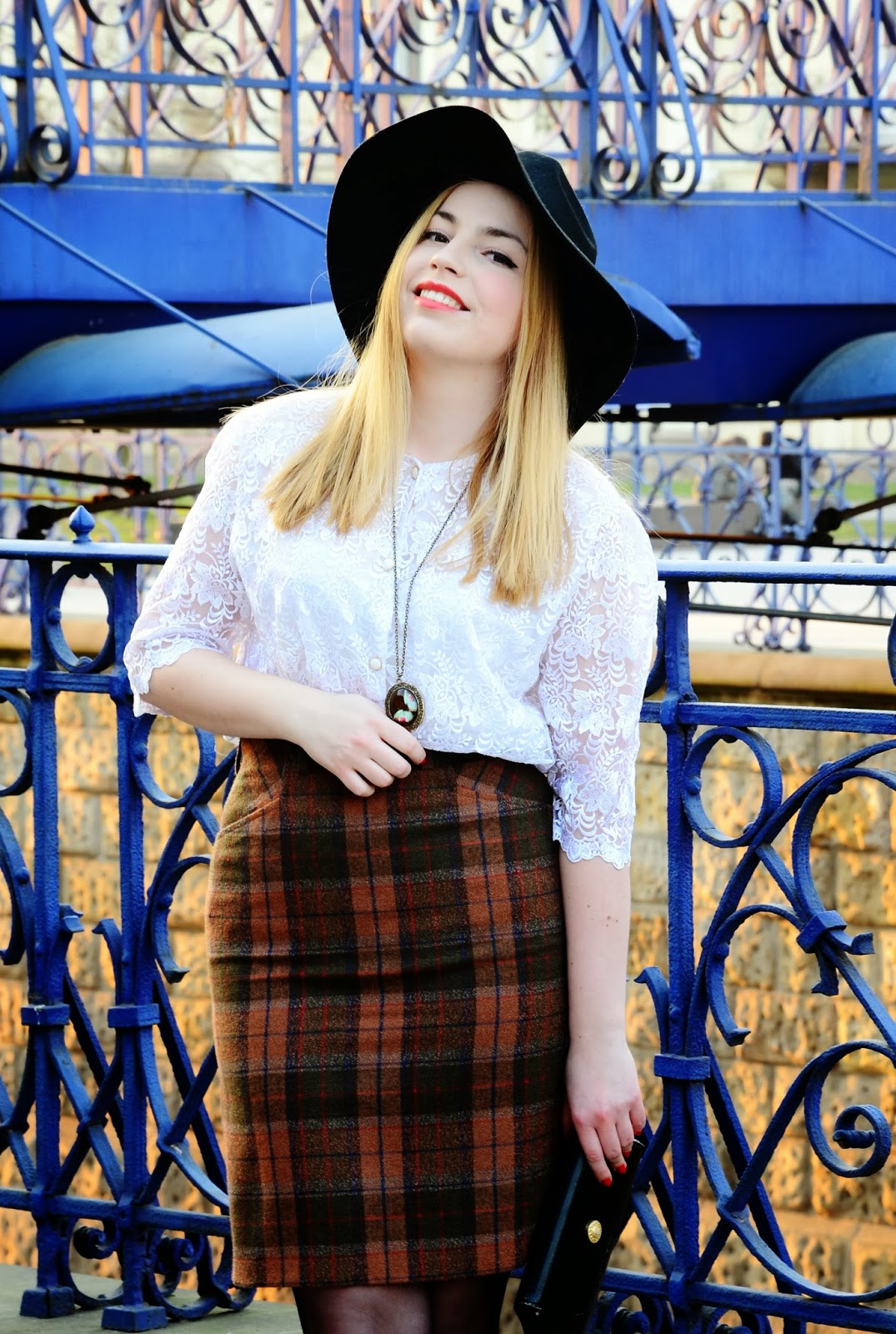 Wszystko oprócz czółenek i kapelusza w tym looku pochodzi z SH. Takie łupy były że ho ho! Jak tylko zobaczyłam tę spódnice i spojrzałam na cenę ( 3zł serio?? ) wiedziałam, że będzie moją ulubienicą. Za to koszula z początku wydawała mi się mega babcina ale jak ją przymierzyłam zmieniłam zdanie. Ma prześliczną koronkę i wszystkie perłowe guziki. Aż mnie dziw bierze, że nikt nie poodrywał od niej guzików przede mną. Koronka jest ręcznie robiona i z bliska naprawdę zachwyca. Spódnica natomiast jest super wykonana, ma podszewkę, gruby tweedowy materiał i ma kieszenie! Mam wrażenie, ze teraz już takich porządnych nie szyją a już na pewno nie znajdziemy podobnych w sieciówkach. Kupiłam też drugą w podobnym guście, również w kratę ale zieloną. Płaszcz był już w kilku postach ale przypomnę, że jest również z SH ( kosztował bodajże 7 zł ). Mam nadzieję, ze podoba Wam się taka ilość kraty w zestawie ;)