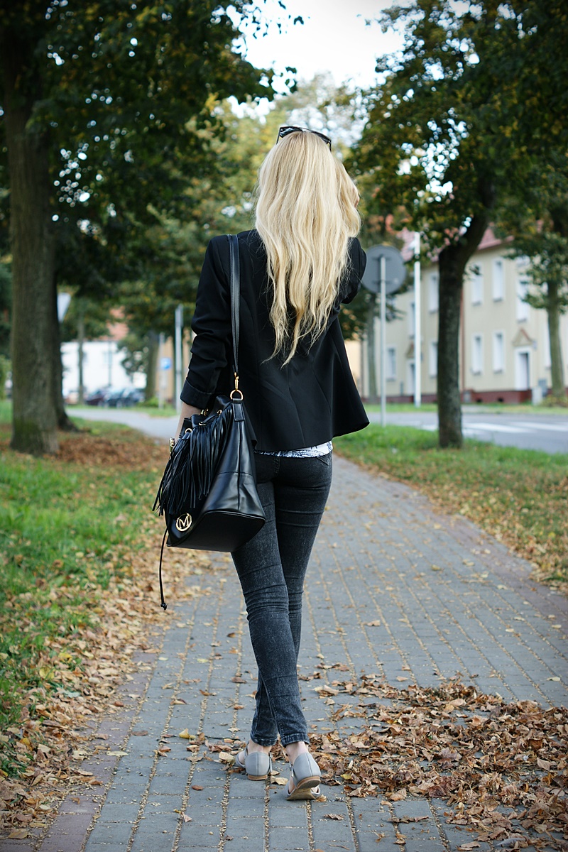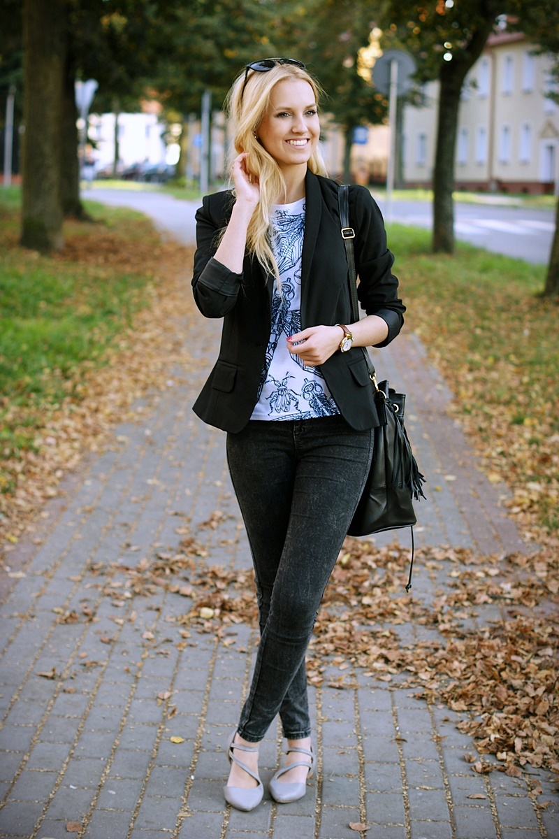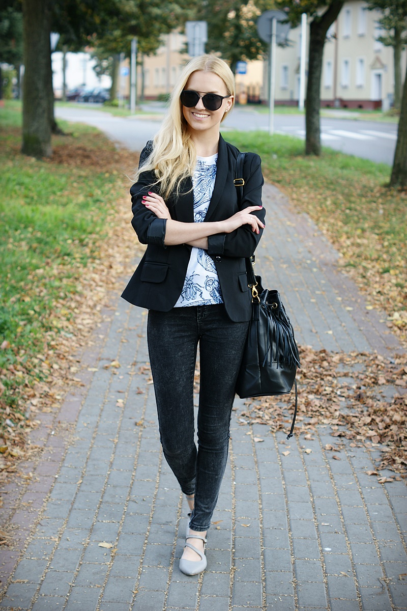 marynarka / jacket - rozmiar34, koszulka / t-shirt - More'moi, dżinsy / jeans - Reserved, baleriny / ballerina - Noevision, torba / bag - Manzana, zegarek / watch - Techtime, okulary / sunglasses - eOkulary