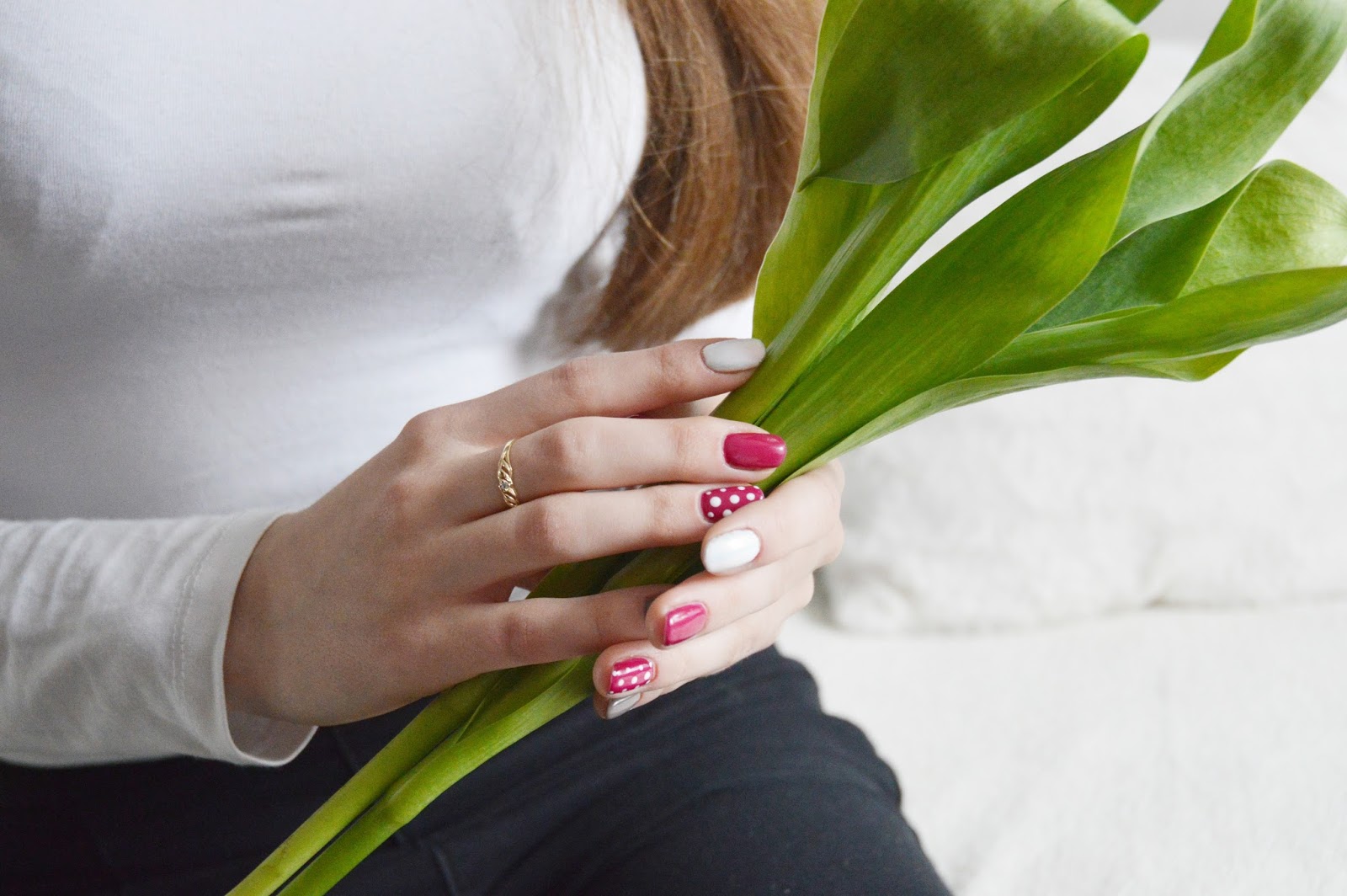 Pomysł narodził się w mojej głowie bardzo spontanicznie, właściwie do końca nie wiedziałam jaki będzie efekt ostateczny. Wisienką na torcie okazały się być urocze kropki. Uważam, że są na maksa wyjątkowe! Żelowy lakier do paznokci w odcieniu 123 Szeherezada to dobra baza jeśli chodzi o zdobienia. Białe kropki robione sondą w różnych rozmiarach są mocno widoczne, bardzo fajnie kontrastują!