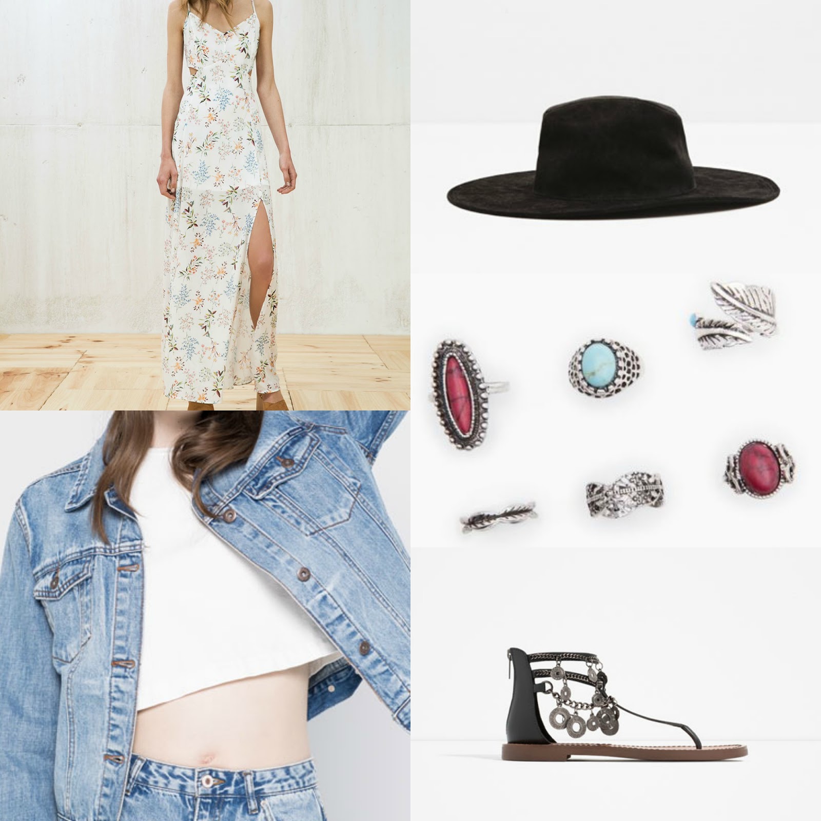 Pierwsza propozycja to biała sukienka maxi połączona z oversize’ową kurtką z jasnego jeansu. Do takiego kompletu idealnie będzie pasował kapelusz z zamszu oraz czarne sandałki z metalowymi zdobieniami. Kropką nad i są pierścionki z kolorowymi kamieniami.
