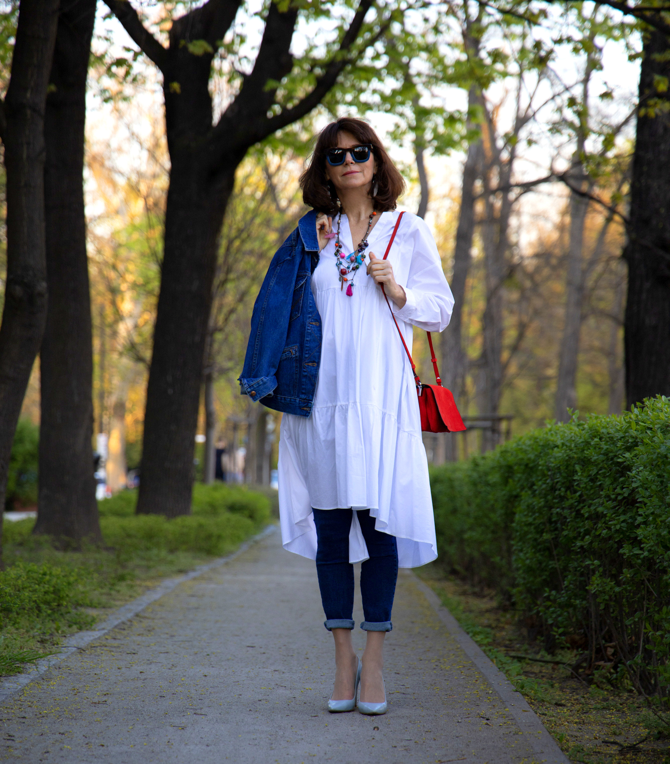 Stylizacja: biała sukienka, a zwłaszcza taka "obszerna", to mój faworyt na lato. Dzisiaj, z racji tego , że jest trochę chłodniej, w wersji z jeansem - jeansowymi spodniami i jeansową kurtką.