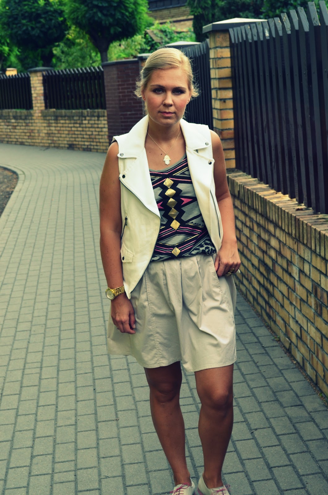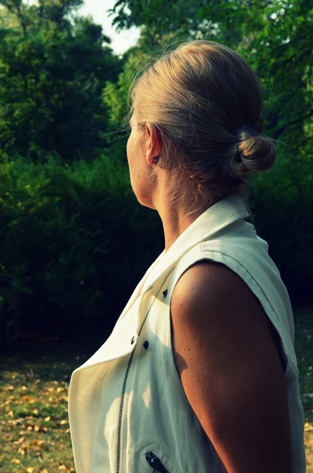 od dawna szukałam białej skórzanej kamizelki ale wszystkie znalezione kosztowały fortunę. W poniedziałek powędrowałam do Zary i znalazłam co prawda bawełniany bezrękawnik ale przeceniony z 199 zł na 79 zł. Bingo. Kupiłam. Może nie jest idealny ale i tak mi się podoba. Nadaje każdej stylizacji charakteru. Będę przełamywać nim eleganckie zestawy jak również romantyczne sukienki. Dzisiejsza stylizacja bardzo na luzie, wygodna ale ciekawa.