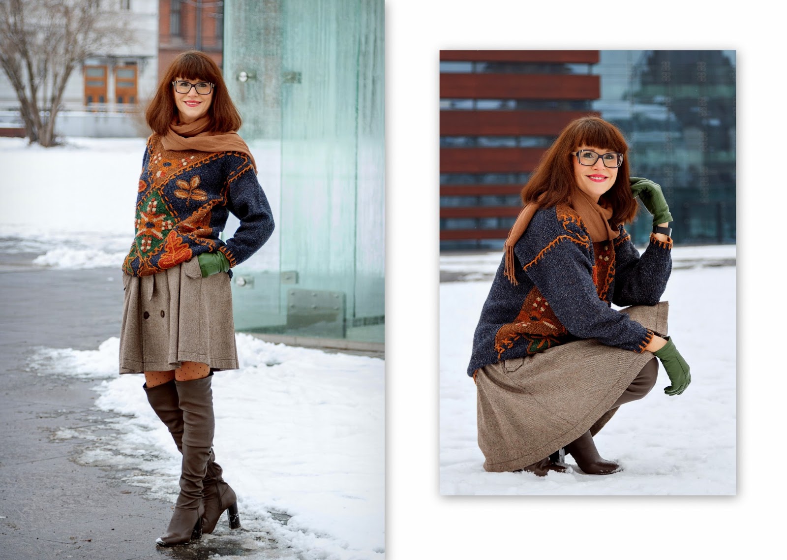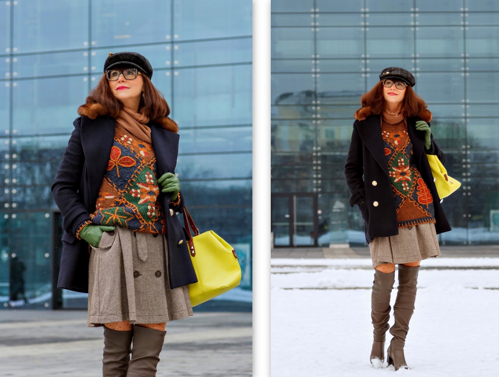 Stylizacja: wełniany sweter, z wrabianymi a częściowo haftowanymi wzorami i lekko rozkloszowana spódniczka o ciekawym kroju, to rzeczy, które ze mną są od jakiegoś czasu. Zestaw ten "uaktualniłam" bardzo wysokimi kozakami, będącymi na topie, oraz dużą torbą. A kaszkiet z ozdobną agrafką dodaje pazura :)