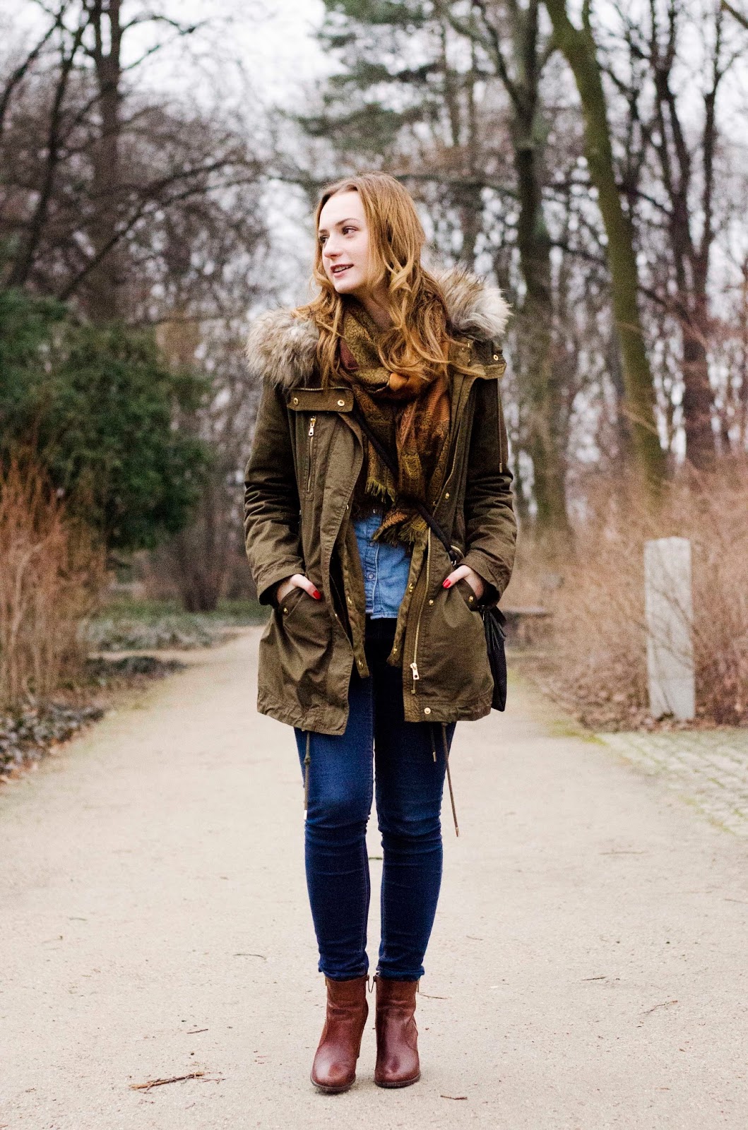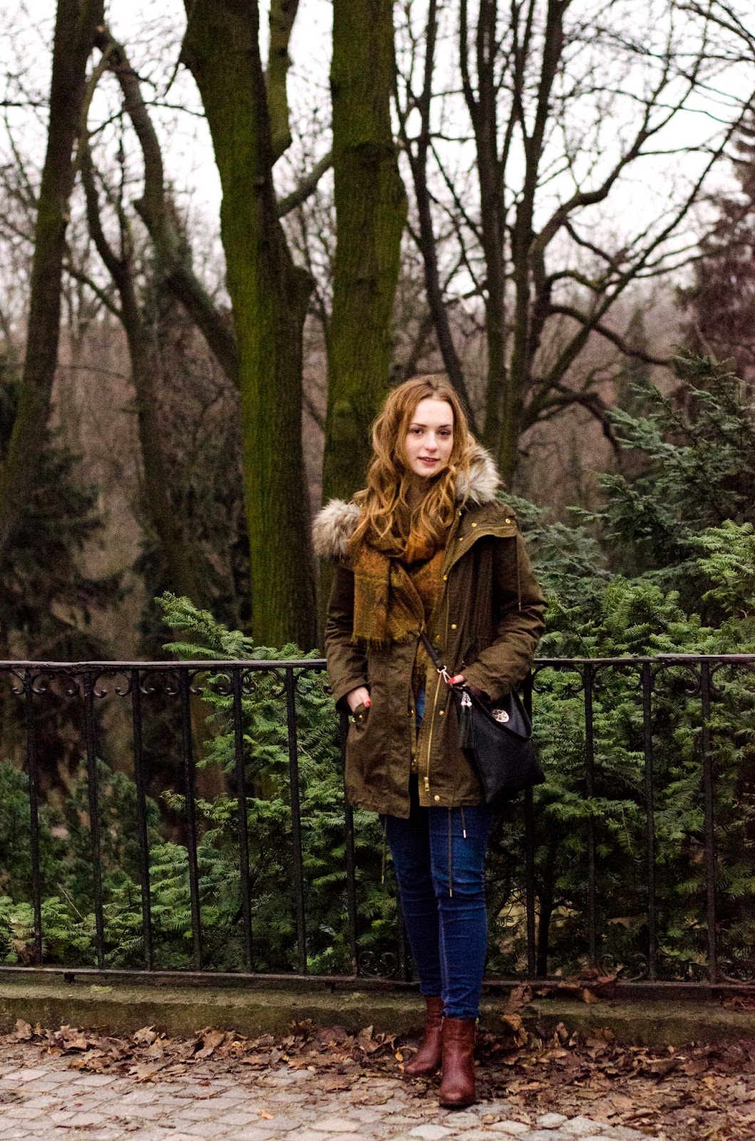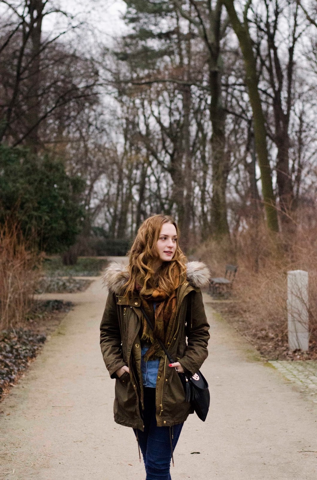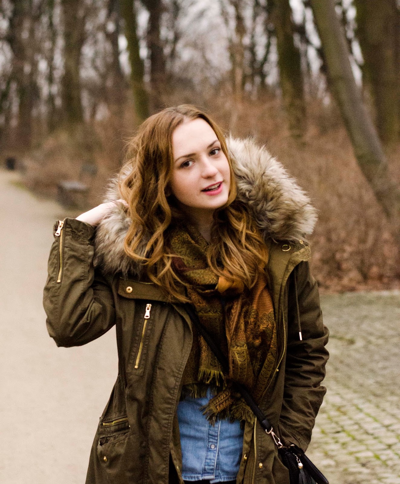 ENG: Days are getting longer and warmer, it's a great reason to go for a walk to a nearby park. The outfit for a walk, should be first of all warm and comfortable. Forget about those high heels, unless you want complain all the time, that your heel is stuck in between the tiles. Boots with a thick heel are the best alternative, they are much more stable, flat shoes or gummies worn with a thick sock are a good idea as well. The basis is also a thick jacket, preferably with a huge hood, which you can put on as soon as it gets colder - you can also throw gloves and hat in your bag. It's best to dress in layers under the jacket, I chose denim look.