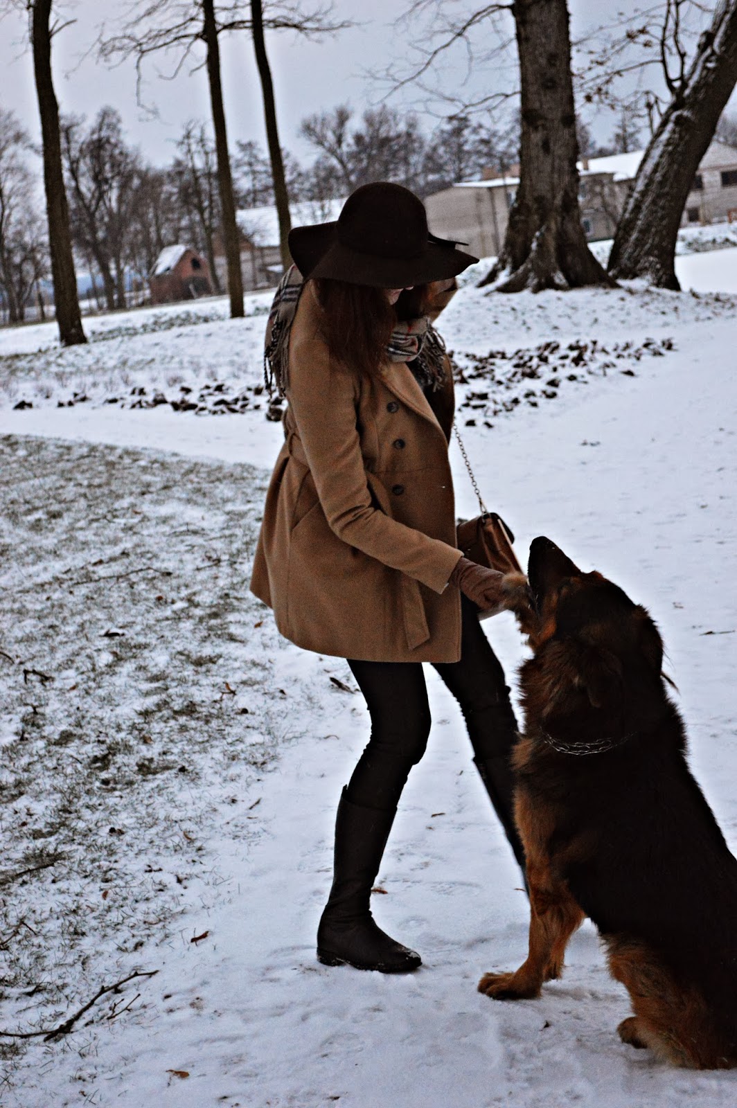Wczoraj na blogu pojawił się post z czymś na ząb, natomiast dzisiaj publikuję zimową stylizację. Karmelowy płaszcz jest jednym z moich ulubionych. Pasuje niemalże do każdej stylizacji. Bardzo przypadł mi do gustu w połączeniu z czernią i szarością. Wydaję mi się, że te zestawienie kolorystyczne nigdy nie przestanie być modnym. Sweter z uroczymi kuleczkami zakupiłam w zeszłym roku w Reserved. Ciepły, dłuższy sprawdzi się jeszcze w niejednym zestawie tej zimy. Ciekawym elementem stroju jest kapelusz. Znalazłam go w sklepie typu Outlet i zapłaciłam za niego 12 zł;) Ostatecznie wyszedł prosty, klasyczny set.