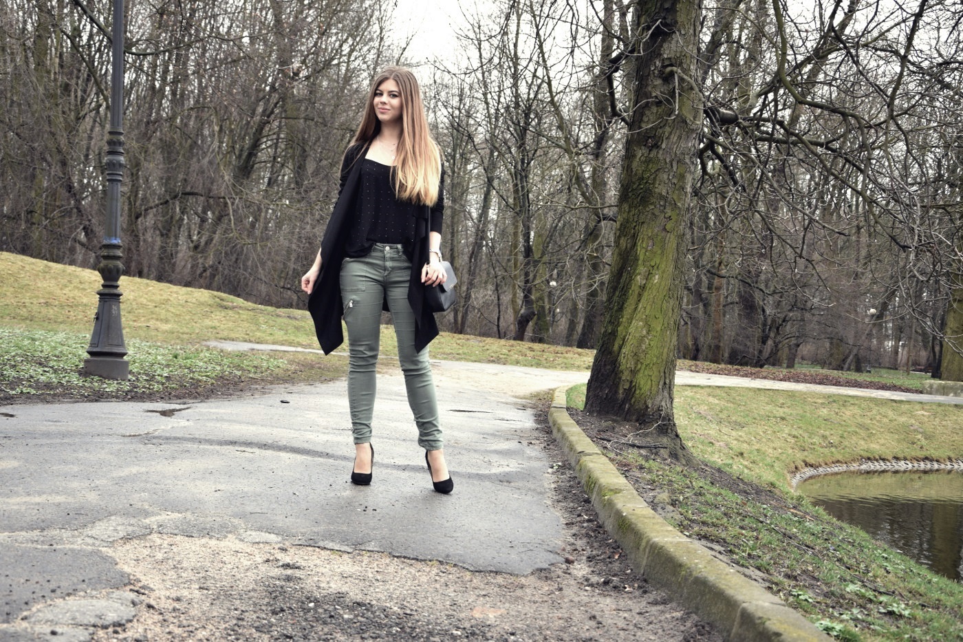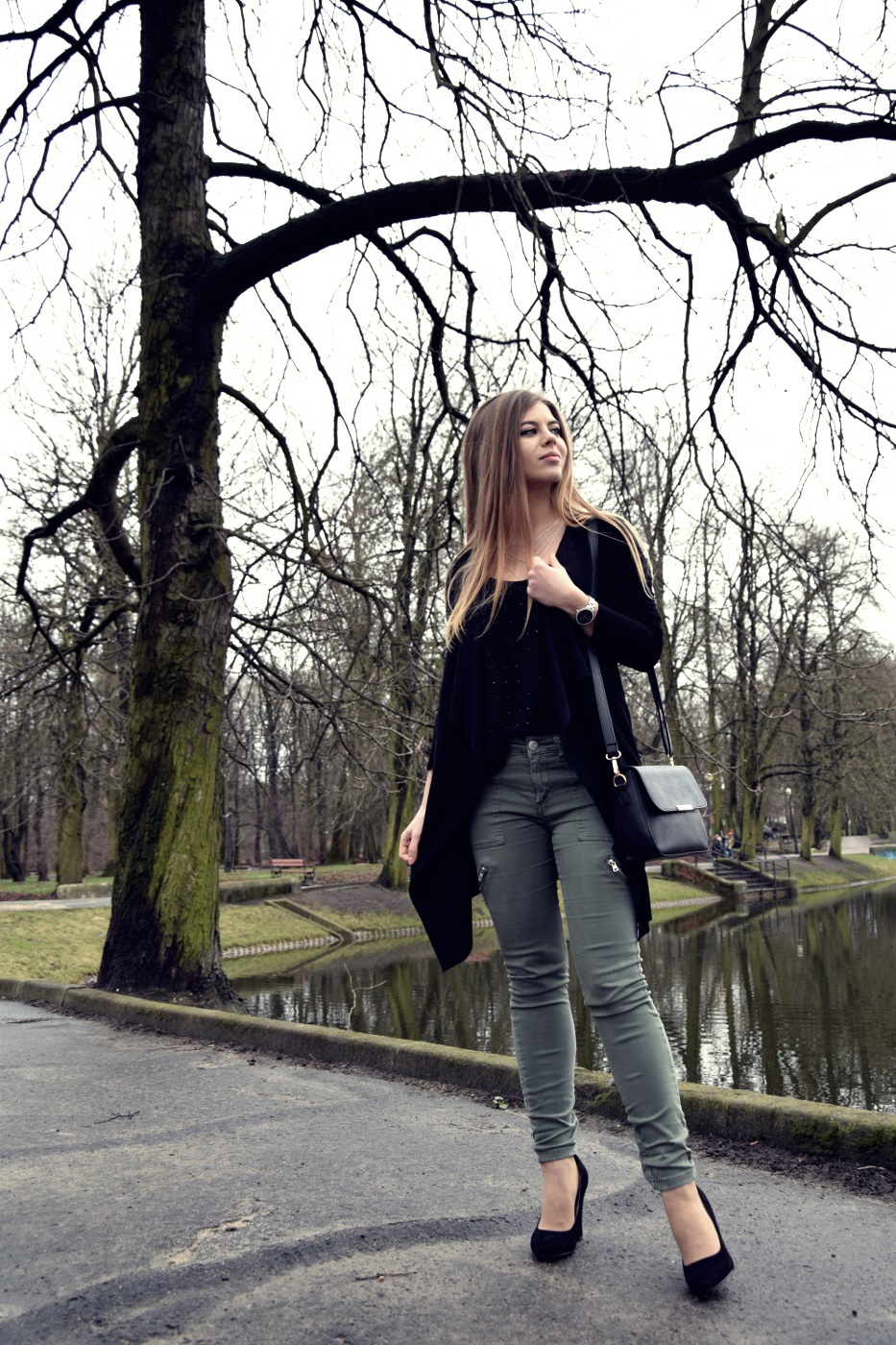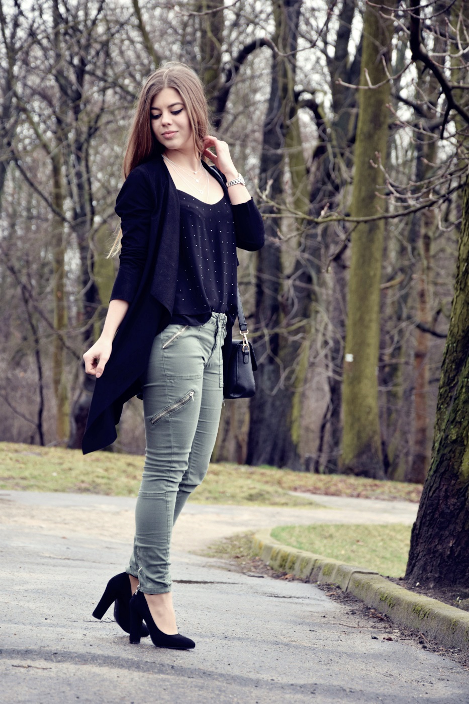 Postawiłam na połączenie dwóch kolorów – czerni i wojskowej zieleni. Jeszcze do niedawna ten odcień zieleni, khaki i moro nie były przeze mnie tak lubione. Uważałam, że to kolory odbierające dziewczęcość i lekkość, jednak po tym jak dałam im szansę, zaopatrując się najpierw w bomber, totalnie się w nich zakochałam. Spodnie, które Wam dzisiaj pokazuję mam już od bardzo dawna, jednak nie wiedzieć czemu nie pokazałam Wam ich jeszcze na blogu. Do nich dobrałam zwiewny top z błyszczącymi dżetami, asymetryczną narzutkę i buty na obcasie. Co do czółenek to nie są one zbyt wygodne, obcas ma 12 cm i zdecydowanie czuć tę wysokość, a stopa szybko się męczy. Jednak na wyjątkowe okazje chętnie będę je zakładać, ponieważ ma paseczek na kostce, który nie dość, że wygląda zgrabnie to jeszcze podtrzymuje nam stopę. Buty w całej okazałości na pewno jeszcze zobaczycie na blogu. Cały zestaw podkreśliłam srebrną biżuterią, która pasuje do licznych suwaków umieszczonych na spodniach. Jak Wam się podoba taka stylizacja? Dajcie znać w komentarzach :)