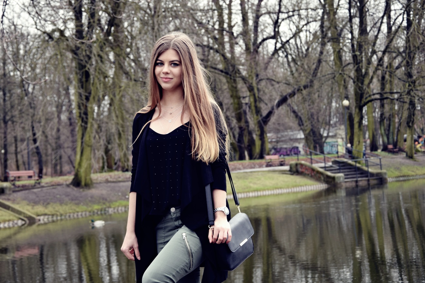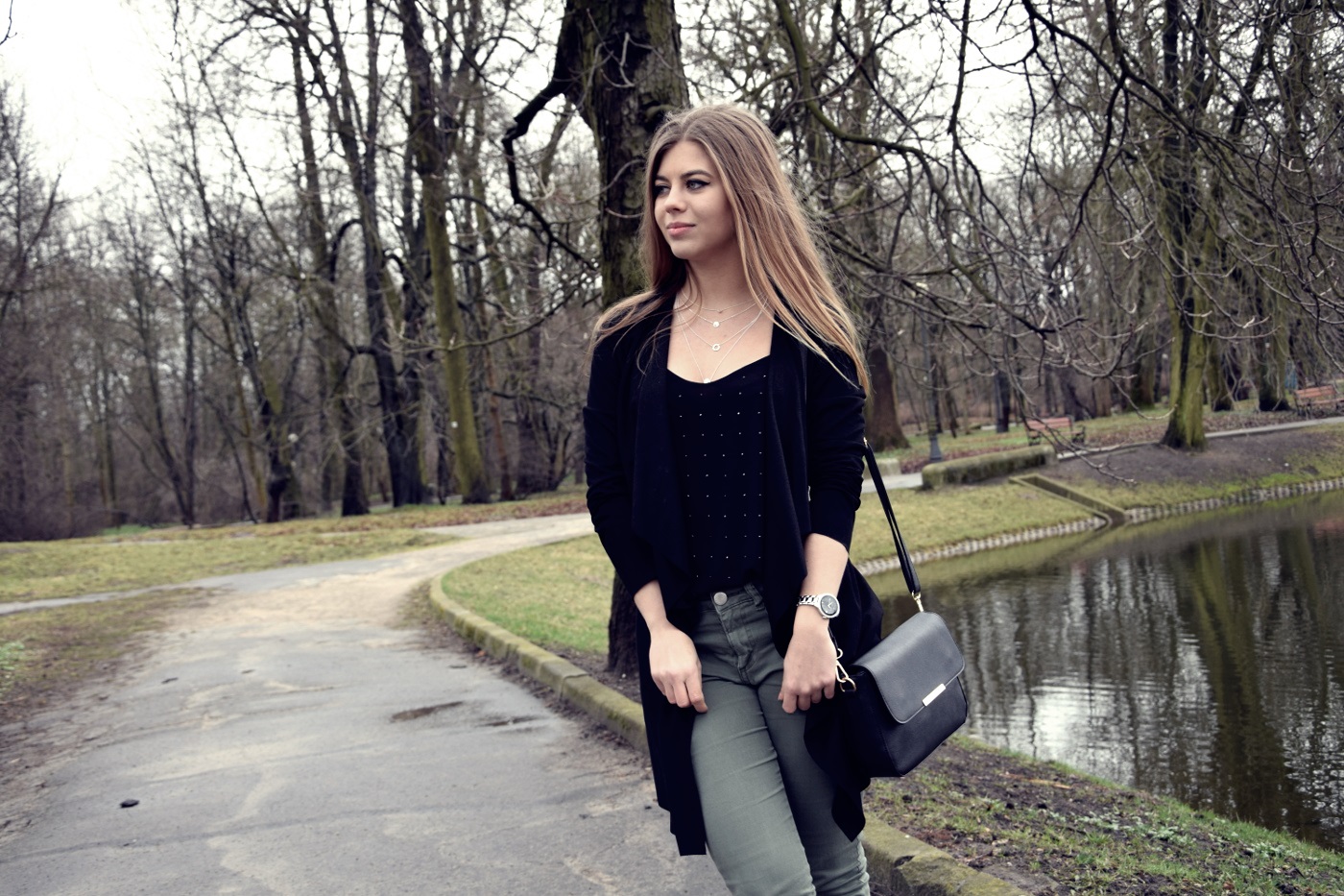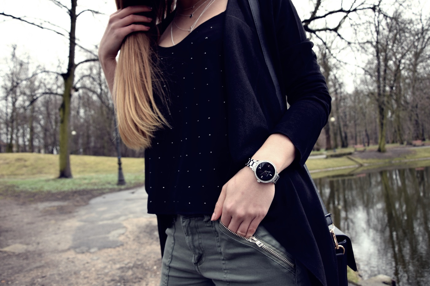 Postawiłam na połączenie dwóch kolorów – czerni i wojskowej zieleni. Jeszcze do niedawna ten odcień zieleni, khaki i moro nie były przeze mnie tak lubione. Uważałam, że to kolory odbierające dziewczęcość i lekkość, jednak po tym jak dałam im szansę, zaopatrując się najpierw w bomber, totalnie się w nich zakochałam. Spodnie, które Wam dzisiaj pokazuję mam już od bardzo dawna, jednak nie wiedzieć czemu nie pokazałam Wam ich jeszcze na blogu. Do nich dobrałam zwiewny top z błyszczącymi dżetami, asymetryczną narzutkę i buty na obcasie. Co do czółenek to nie są one zbyt wygodne, obcas ma 12 cm i zdecydowanie czuć tę wysokość, a stopa szybko się męczy. Jednak na wyjątkowe okazje chętnie będę je zakładać, ponieważ ma paseczek na kostce, który nie dość, że wygląda zgrabnie to jeszcze podtrzymuje nam stopę. Buty w całej okazałości na pewno jeszcze zobaczycie na blogu. Cały zestaw podkreśliłam srebrną biżuterią, która pasuje do licznych suwaków umieszczonych na spodniach. Jak Wam się podoba taka stylizacja? Dajcie znać w komentarzach :)