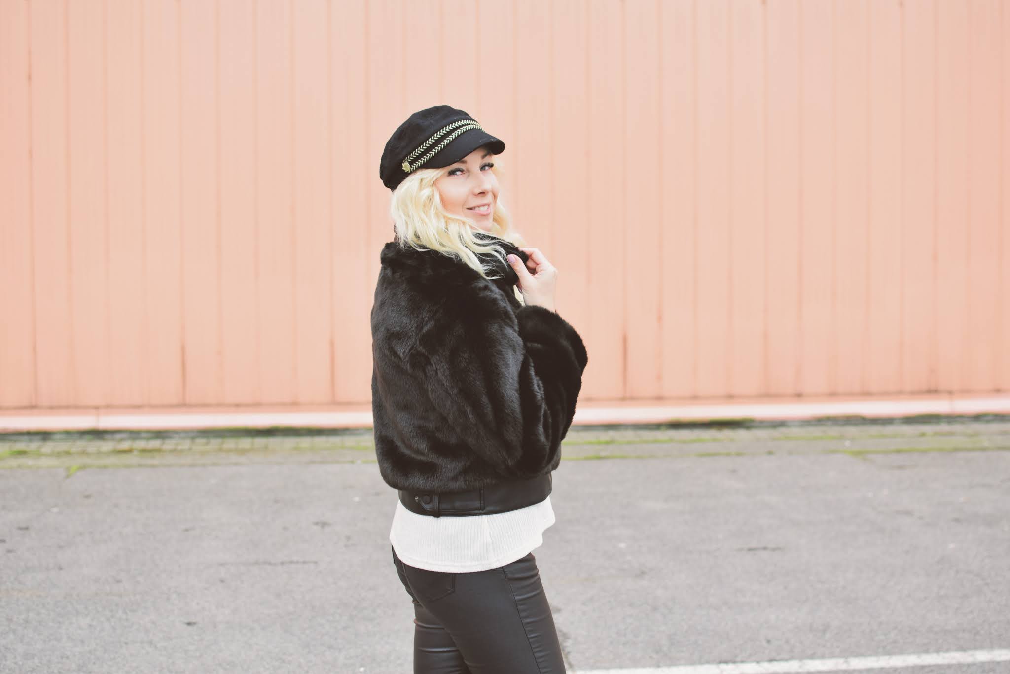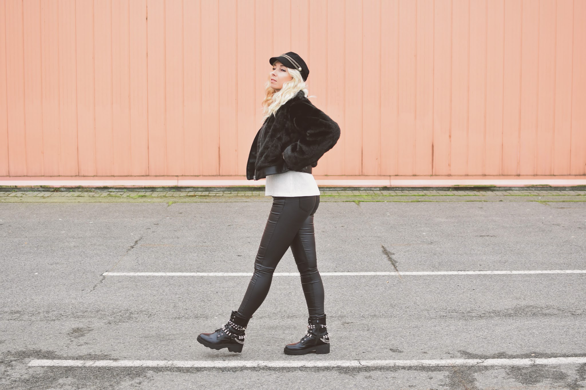 Stylizacja jest prosta, ponieważ zawiera tylko dwa kolory: czarny z dodatkiem białego w postaci sweterka z golfem. Ma jednak sporo detali, które dodają jej charakteru. Wspomniane wyżej botki naszpikowane ćwiekami, łańcuchami itp., blogerka czapka i krótkie futerko z nowej kolekcji marki Orsay. Wszystkie te elementy tworzą ciekawą jesienną stylizację. Warto również dodać, że woskowane spodnie nie wychodzą z trendów od kilku sezonów i opłaca się mieć je w szafie.