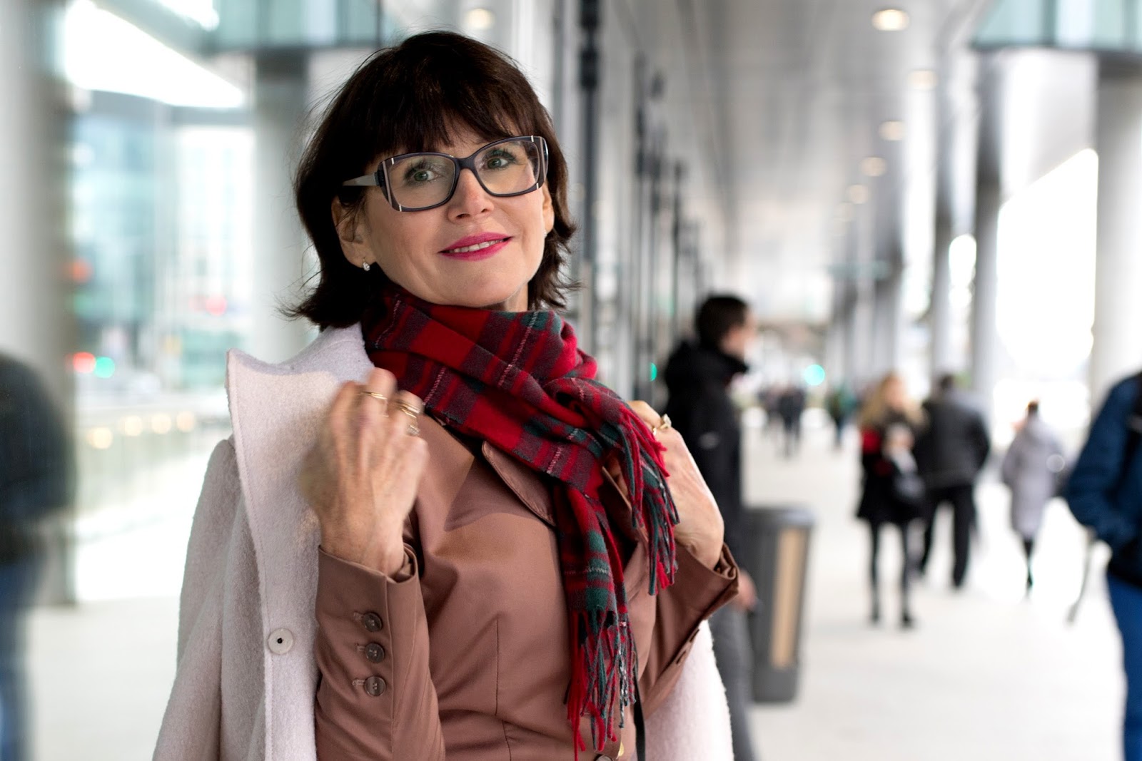 Ale dzisiaj jeszcze na elegancko, z żakietem w kolorze bardzo brudnego różu, z szalikiem w kratę i złotymi dodatkami - buty, wisior i bardzo delikatne kolczyki. Do tego nieoczywista torebka, ale bardzo pasująca do całości :)