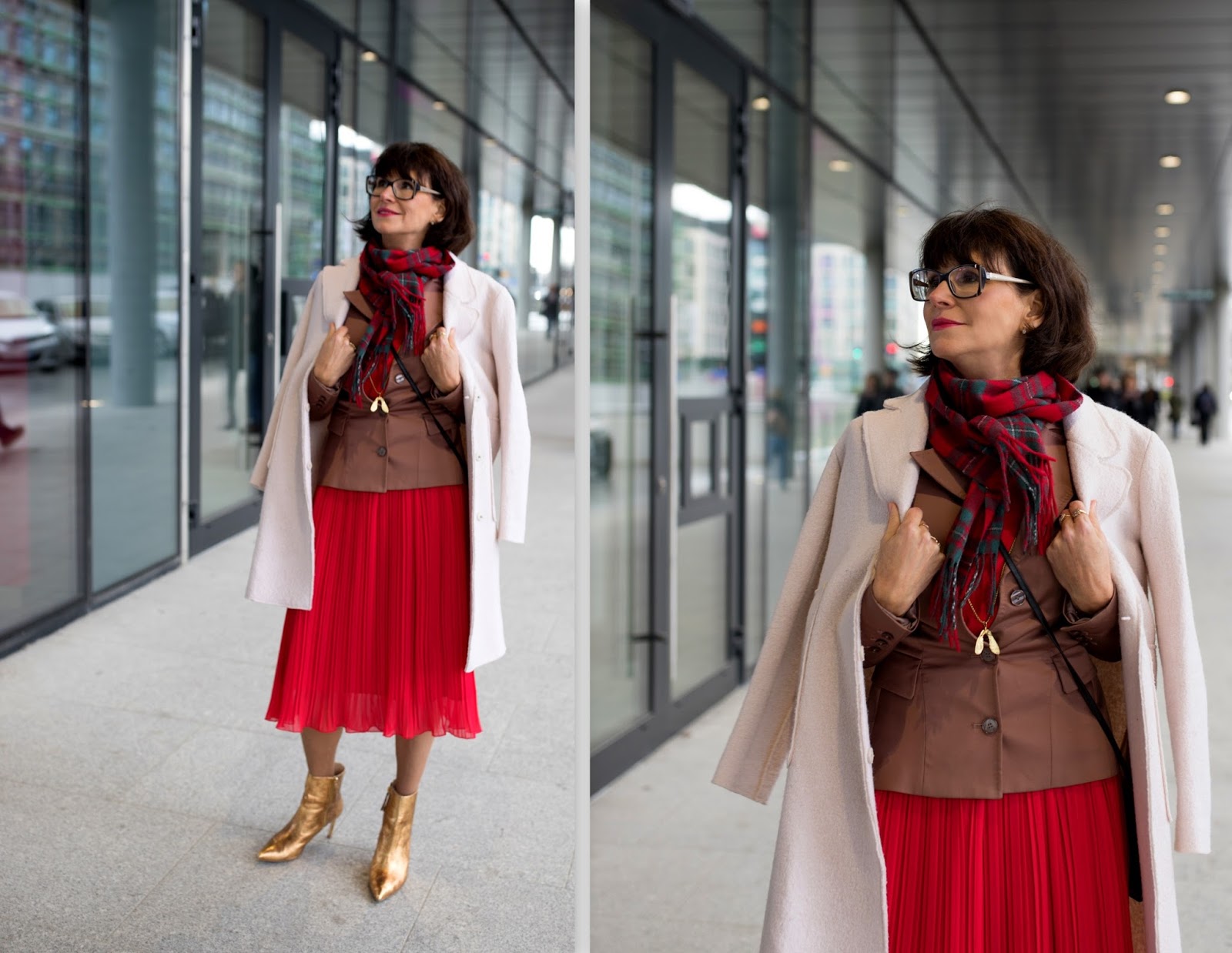 Stylizacja: nie jest z cyklu "na czerwono" bo czerwony jest modny! Nie, po prostu mam czerwoną sukienkę, którą bardzo lubię, która ma prosty ale bardzo wdzięczny fason, która ma ładny, czerwony kolor, w której bardzo dobrze się czuję i już się raz w niej letnią porą pokazała, TUTAJ. A teraz, kolejna, tym razem jesienna, prezentacja tej sukienki i tyle :) I chociaż jest to sukienka raczej z przeznaczeniem na cieplejsze dni, to w te chłodniejsze ubieram ją częściej. Bo bardzo lubię zestawienie zwiewnego, a nawet przezroczystego dołu z ciepłą, obszerną górą. Dlatego wkładam taką kieckę, na nią grube swetrzysko, sportowe obuwie i ruszam na miasto :)