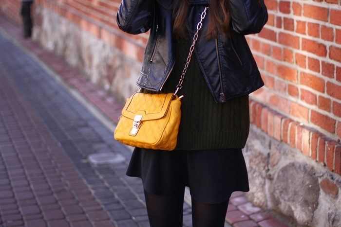 Ola: sweter Vinted.pl | spódniczka sh | ramoneska H&M | torebka Monnari | botki Pimkie | okulary House | bransoletka House of Mima