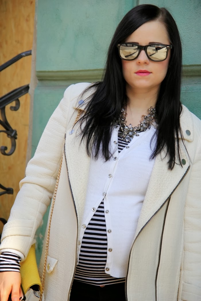 Bluzka - lokalny sklep | Sweter - Simple CP | Spodnie - H&M mum | Torebka - Mohito | Naszyjnik - Zara | Szpilki - Centro | Płaszcz - Zara | Okulary - Glitter |