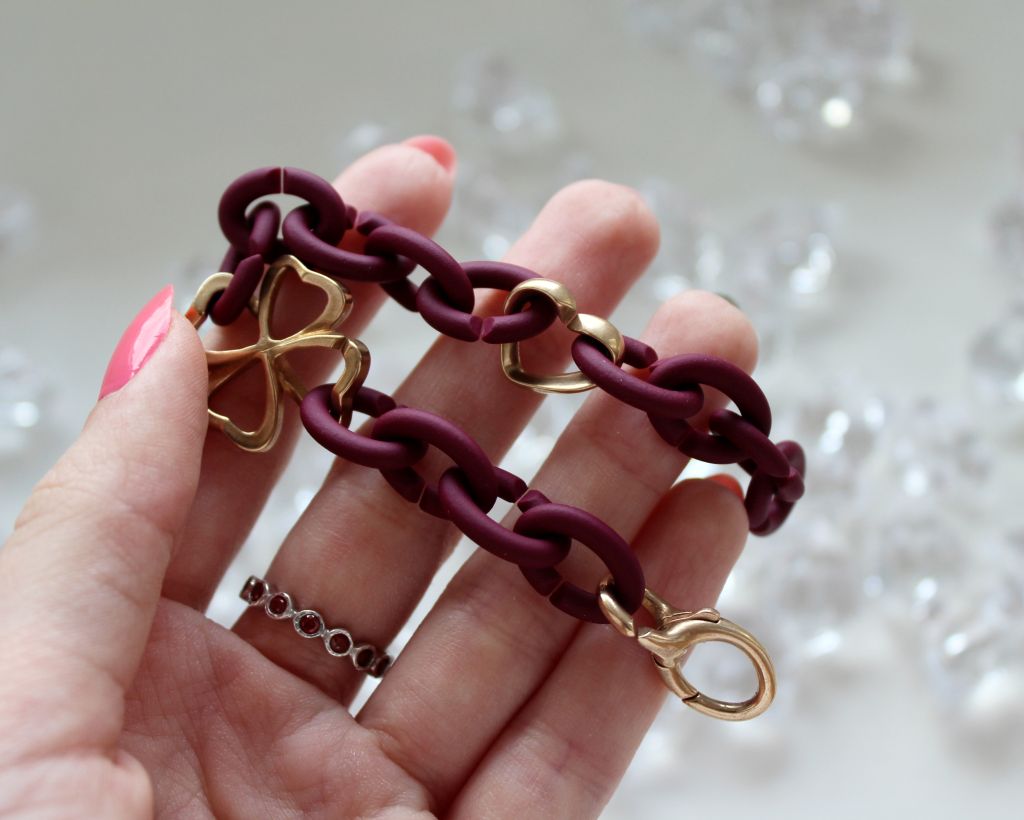 Bransoletki są robione na wzór łańcuchów, lecz każde oczko wykonane jest z przyjemnej w dotyku gumy, która nadaje całości oryginalności. Dodatkami do każdej bransoletki są linki, które wykonane są ze srebra bądź brązu. Najważniejszym aspektem bransoletek jest to, że same tworzymy je od początku do końca. Możemy wybrać sobie kolor gumy, a także linki, których mamy naprawdę szeroki wybór. W mojej kompozycji znalazła się czterolistna koniczynka i serduszko wykonane z brązu. Dlaczego akurat takie linki? Koniczynka na szczęście, taki mój amulet, który mogę mieć ze sobą, a serduszko z miłości do wielu rzeczy i nie tylko ;)