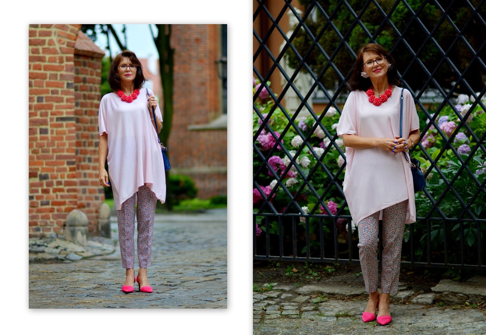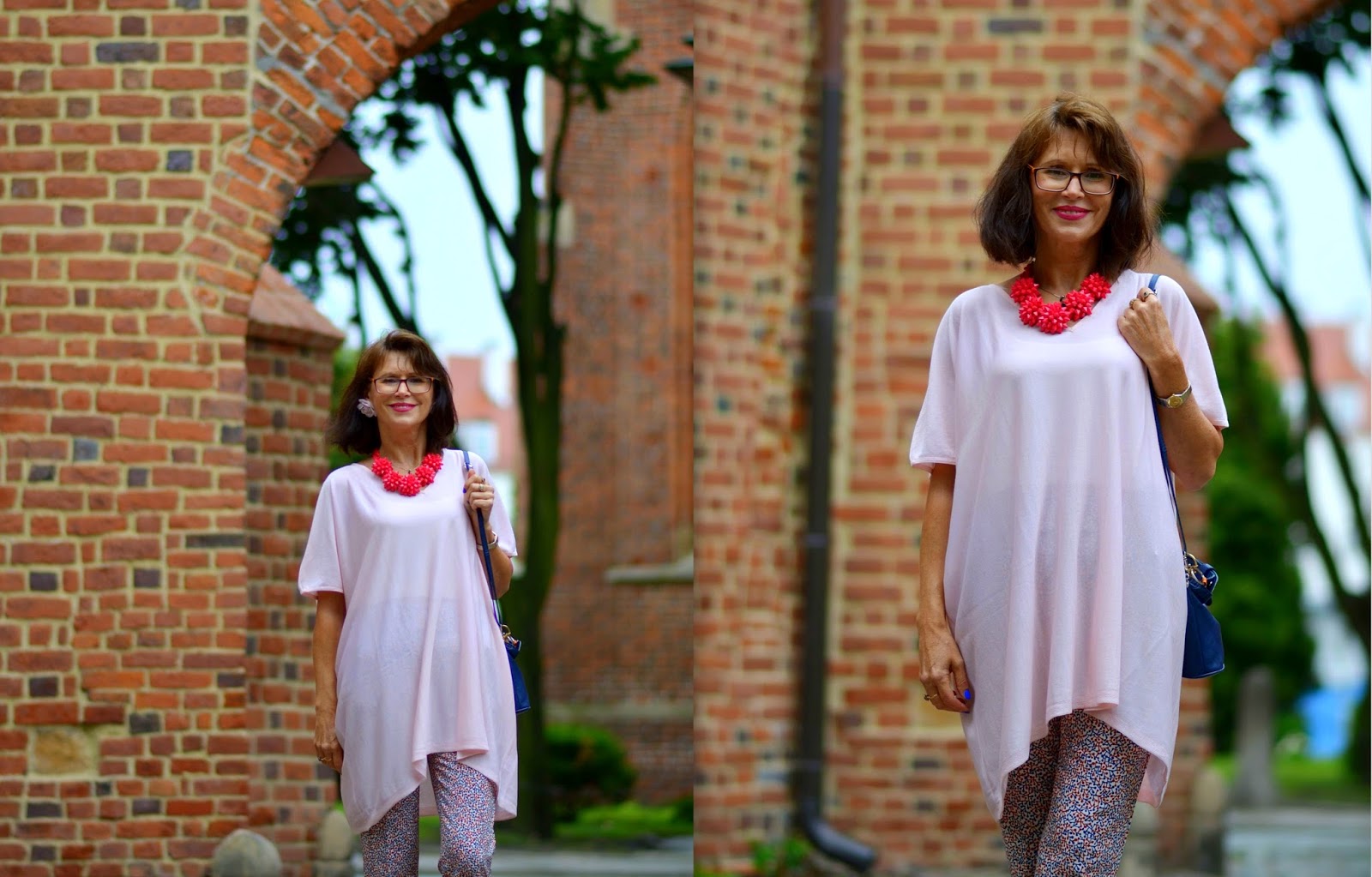 Stylizacja: no i się okazało, że właśnie przy tej bramie kilka fotek zrobiłyśmy ;) Trochę postraszył nas deszcz, na szczęście tylko postraszył, bo kompletnie na niego nie byłam przygotowana. Luźna, oversize-owa bluzka zdecydowanie bardziej sprawdza się przy ładnej pogodzie i całkiem nieźle komponuje się z cygaretkami ;) A satynowe szpilki bardzo nie lubią kałuż. Dobrze, że wzięłam ze sobą szary kardigan to przynajmniej nie zmarzłam :)