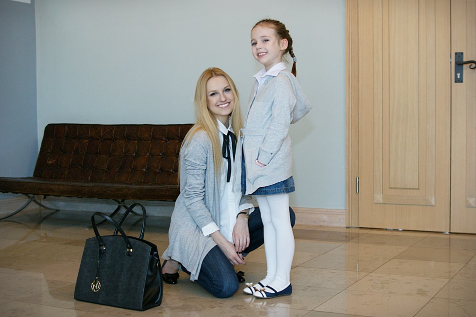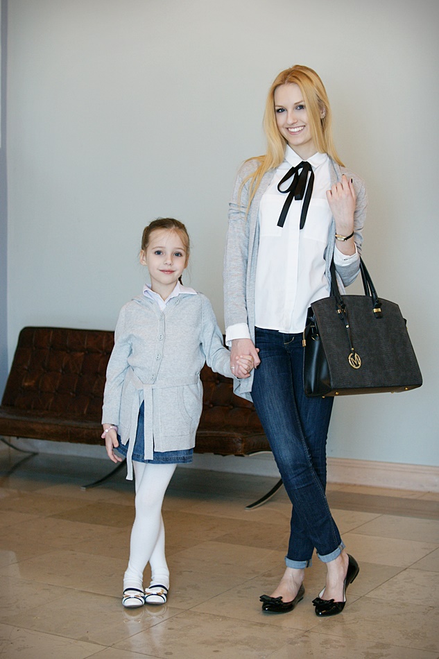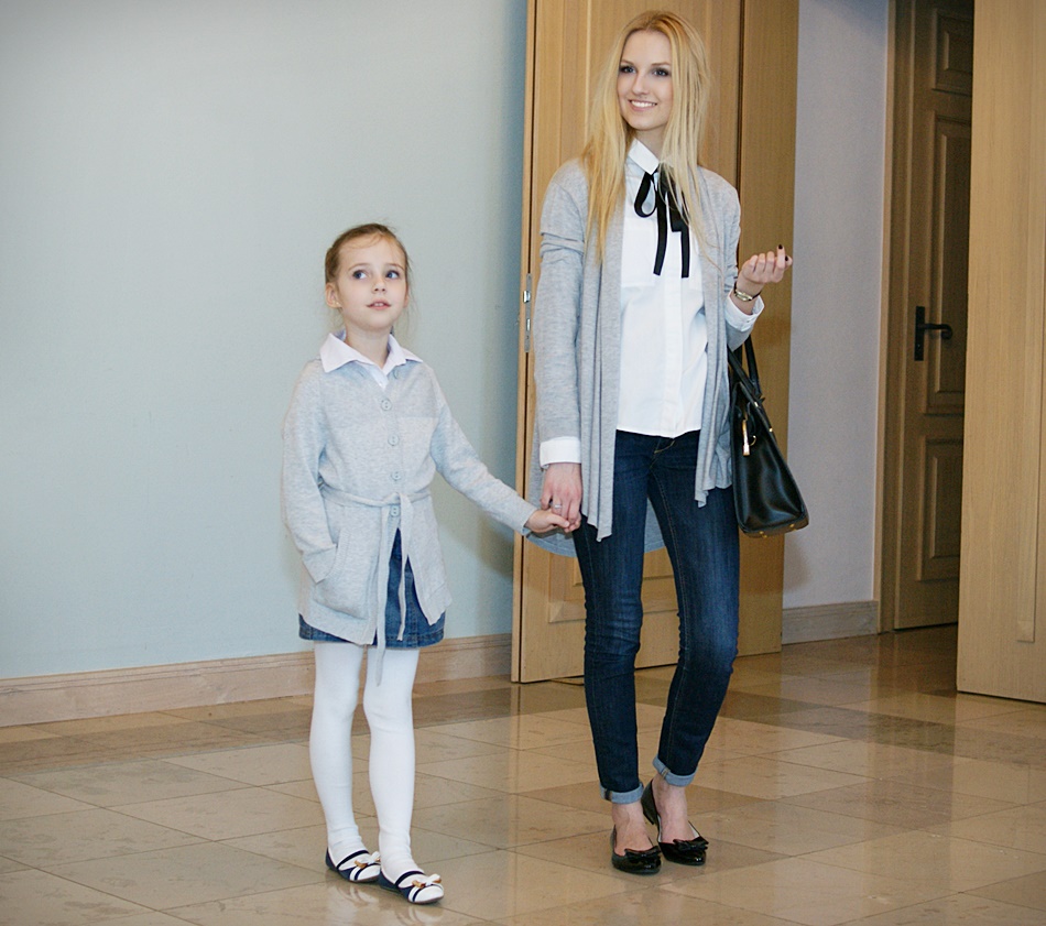 Dzisiaj, korzystając z wolnego czasu, przygotowałam wpis ze zdjęciami, na których poza mną, po raz kolejny zobaczycie Oliwię. Jednak w odróżnieniu do ostatniej wspólnej sesji, tym razem nasze stylizacje są eleganckie. Jak zapewne zauważycie, wyglądamy bardzo podobnie. Wybrałam dla nas lakierowane baleriny, białe koszule i szare sweterki. Połączyłam je z dżinsowymi "dołami". Takie zestawy, jak już wspomniałam w tytule wpisu, sprawdzają się w każdym wieku. Ciekawa jestem, jak podobają Wam się takie bliźniacze zestawy? :)