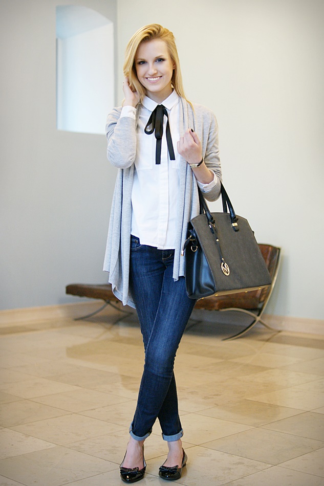 Jak widzicie, pasek, który początkowo stanowił część sweterka, posłużył jako ozdoba białej bluzki. Stworzenie z niego kokardki było strzałem w dziesiątkę.
