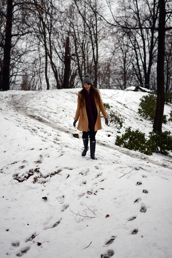 Przedstawiam Wam zatem zimowych bohaterów, poddanych trendom dorosłych: czapkę Zary, kupioną w zeszłym roku w lutym, kiedy na szybko musiała zastąpić podobną - szarą z bąblem made by Orsay, która wysunęła się spod łokcia podczas zakupów w Tesco (tak chodziłam i pytałam w kasach, w BOK i nikt nic nie oddał), kalosze w środku zimy, bo zapadałam się w śniegu, więc sztybletów żal, i dużo, dużo wełny w płaszczu, swetrze i szaliku, bo jakość, bo dobrze grzeje na zimnie itp.