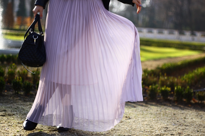 Ciepła i słoneczna pogoda skłania mnie do nakładania dość lekkich i zwiewnych rzeczy. Spódnicę już poznaliście i powiem, że za każdym razem jak mam ją na sobie, cieszę się z zakupu. Sposób w jaki układa się podczas chodzenia sprawia, że czuję się jakbym się unosiła nad ziemią. Tym razem również postawiłam na sweter jednak w nieco zbliżonych kolorach do odcieniu spódnicy (kolorowe nitki dają świetne wrażenie przez co nie jest zbyt cukierkowy). Nieco dziewczęcy urok przełamuje ramoneska i botki na koturnie (gorąco polecam, najwygodniejsze buty na obcasie jakie posiadam w szafie!).